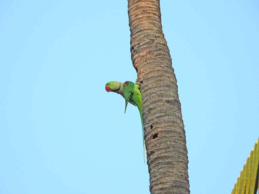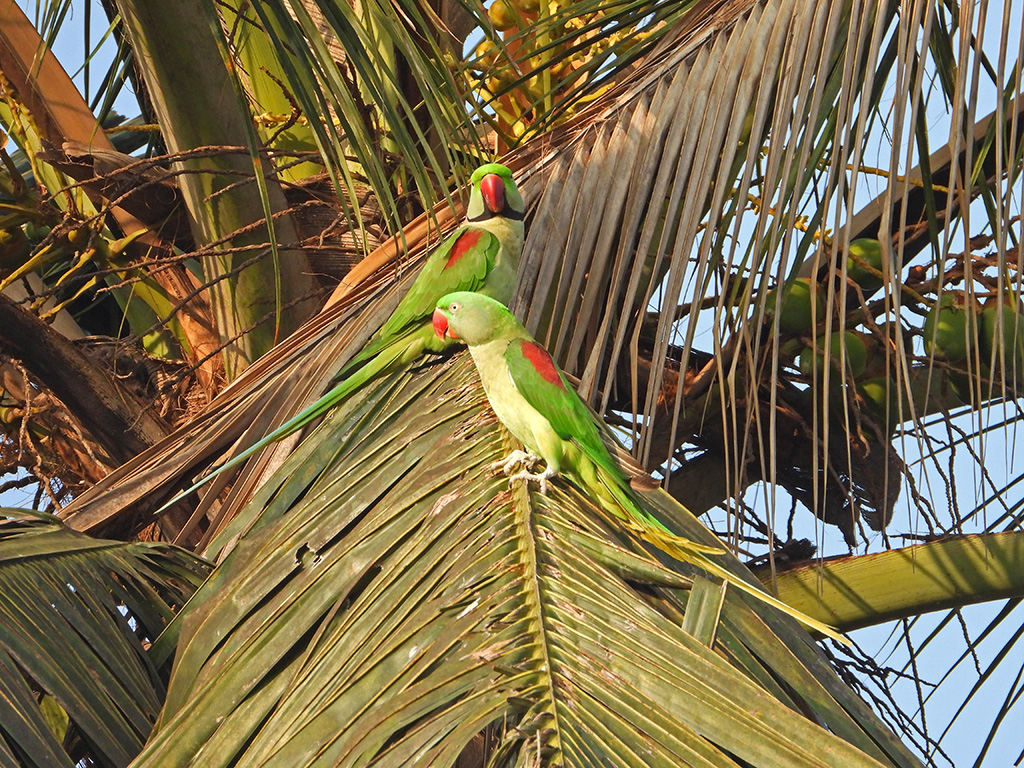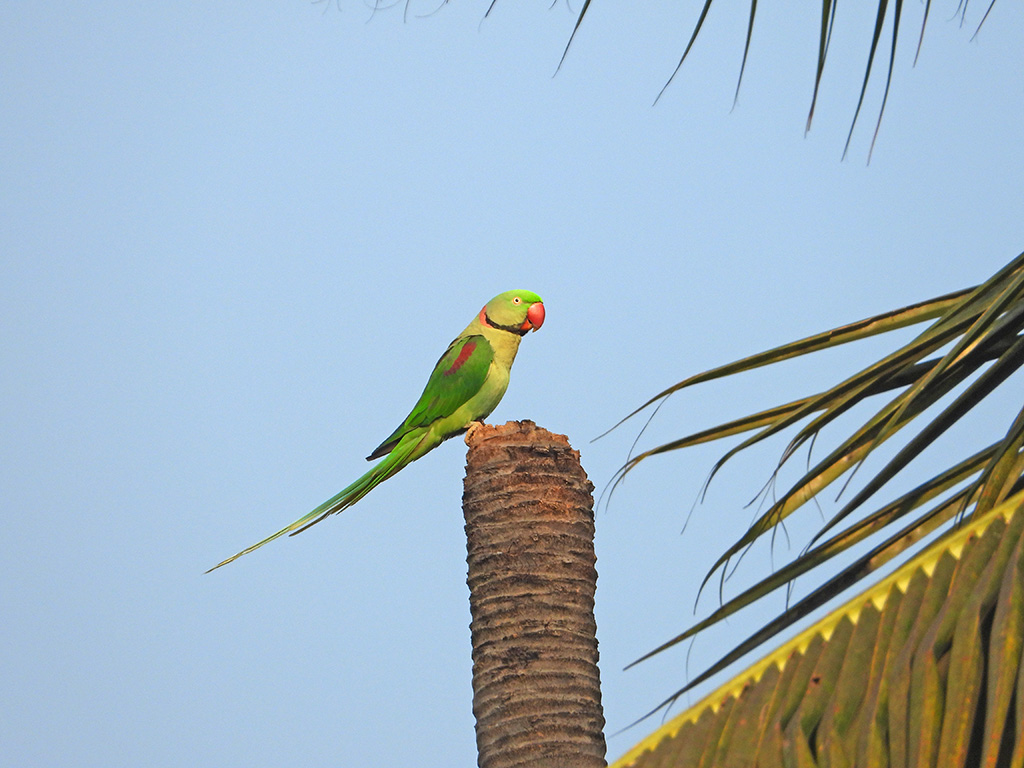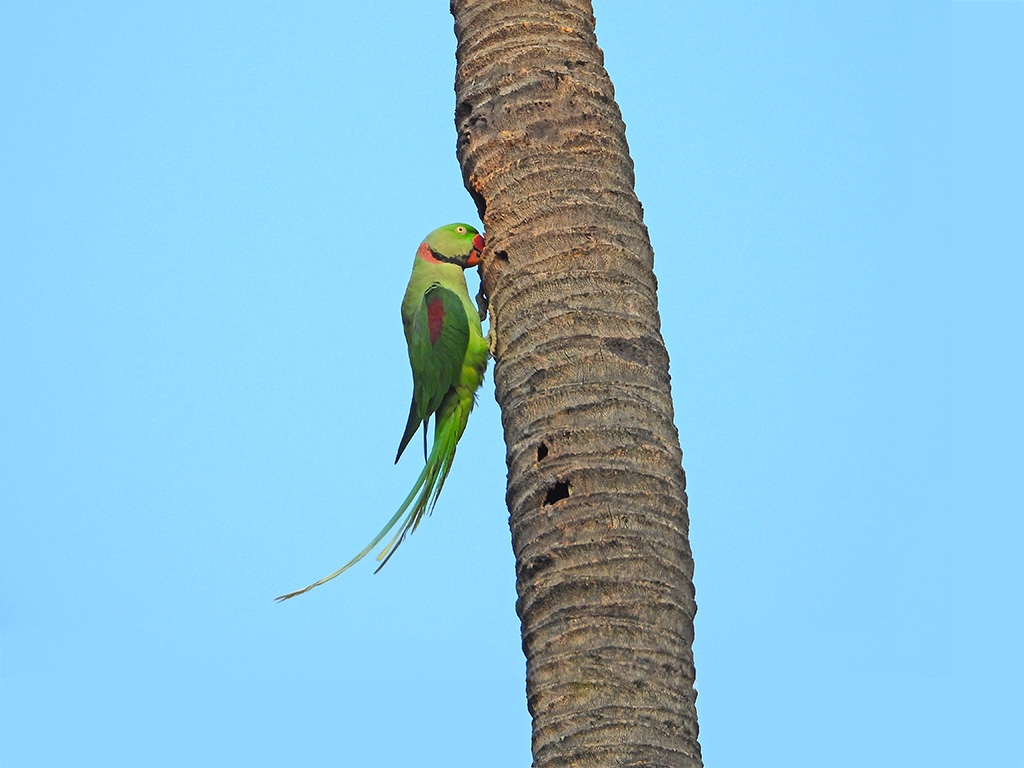 | Approximate size(adult): | Length about 58–62 cm including tail; weight ~200–300 g. Large parakeet with predominantly green plumage, bluish shoulder patch, long tail, and red beak. Males have a maroon patch on the wings and a black-and-pink neck ring.