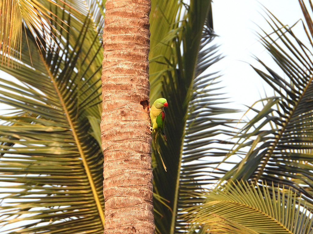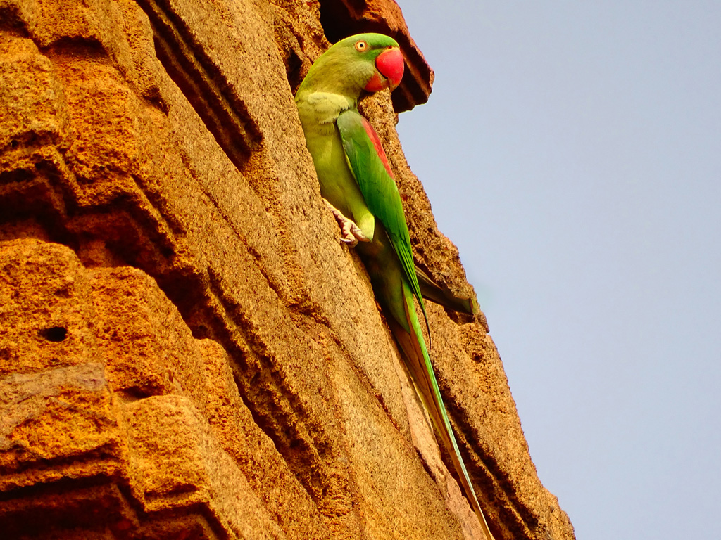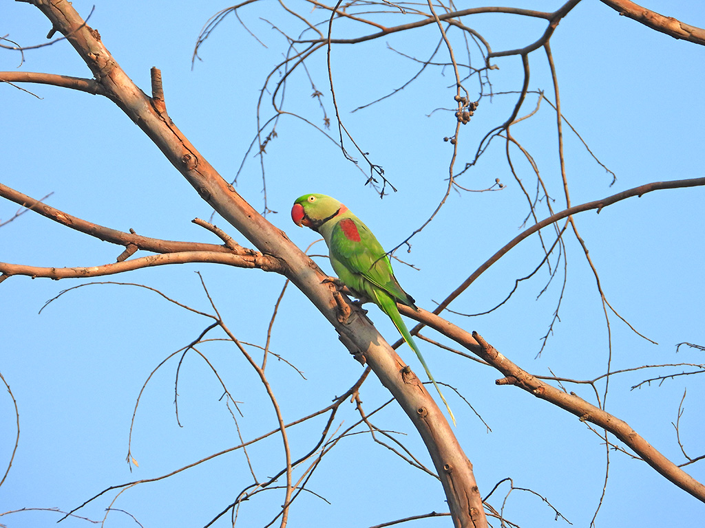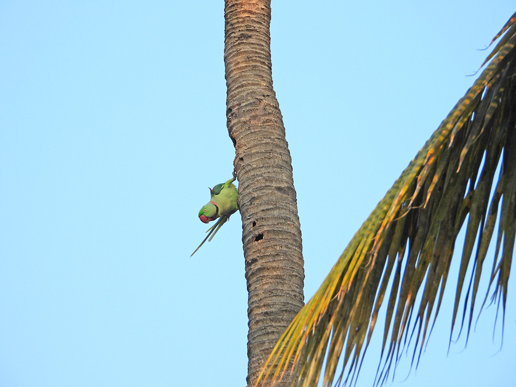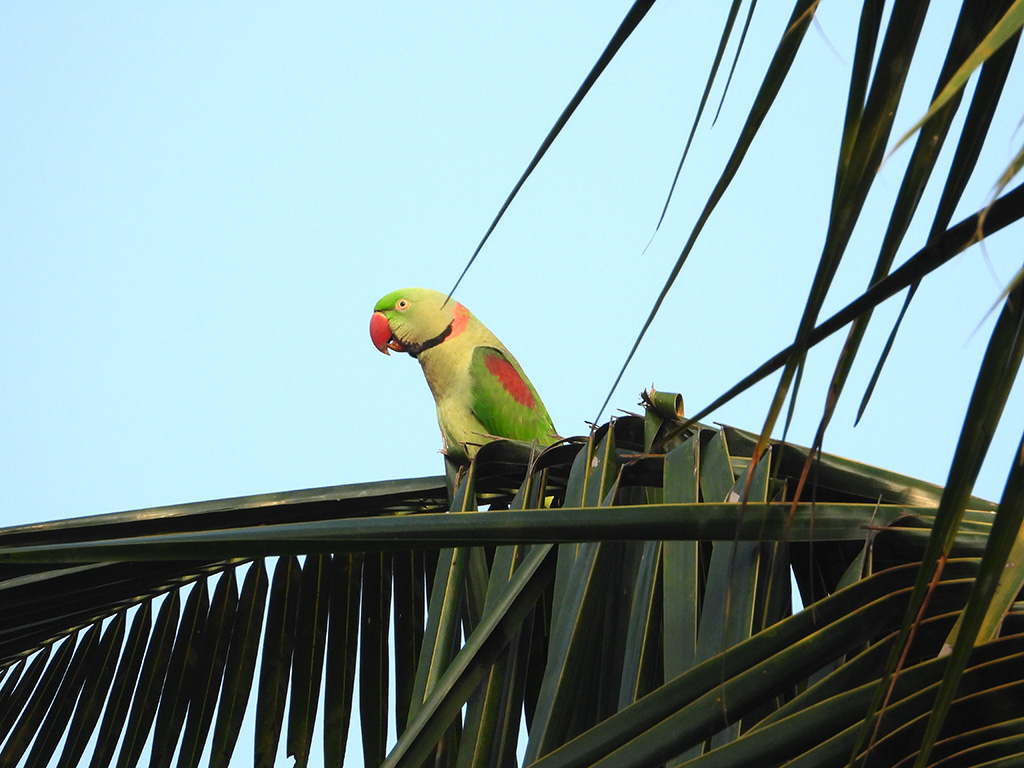 | Approximate size(adult): | Length about 58–62 cm including tail; weight ~200–300 g. Large parakeet with predominantly green plumage, bluish shoulder patch, long tail, and red beak. Males have a maroon patch on the wings and a black-and-pink neck ring.