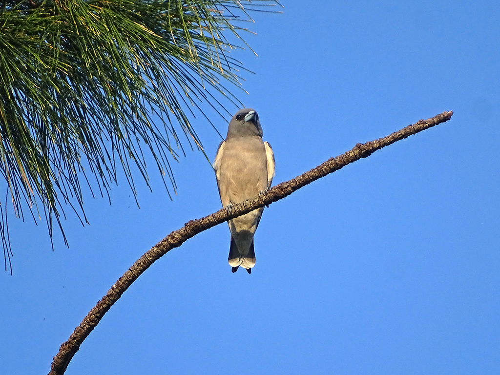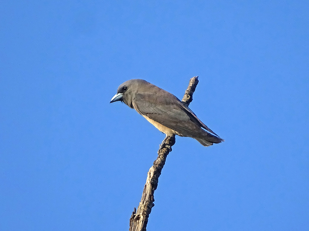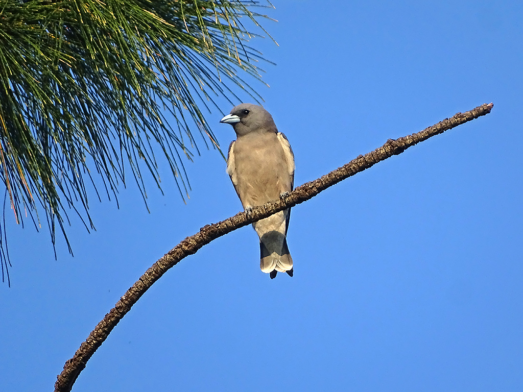 | Approximate size(adult): | A small, compact bird measuring 18–20 cm in length. It has ashy-grey plumage, a pale grey face and underparts, blackish flight feathers, and a short, slightly hooked bill. The tail is short and square.