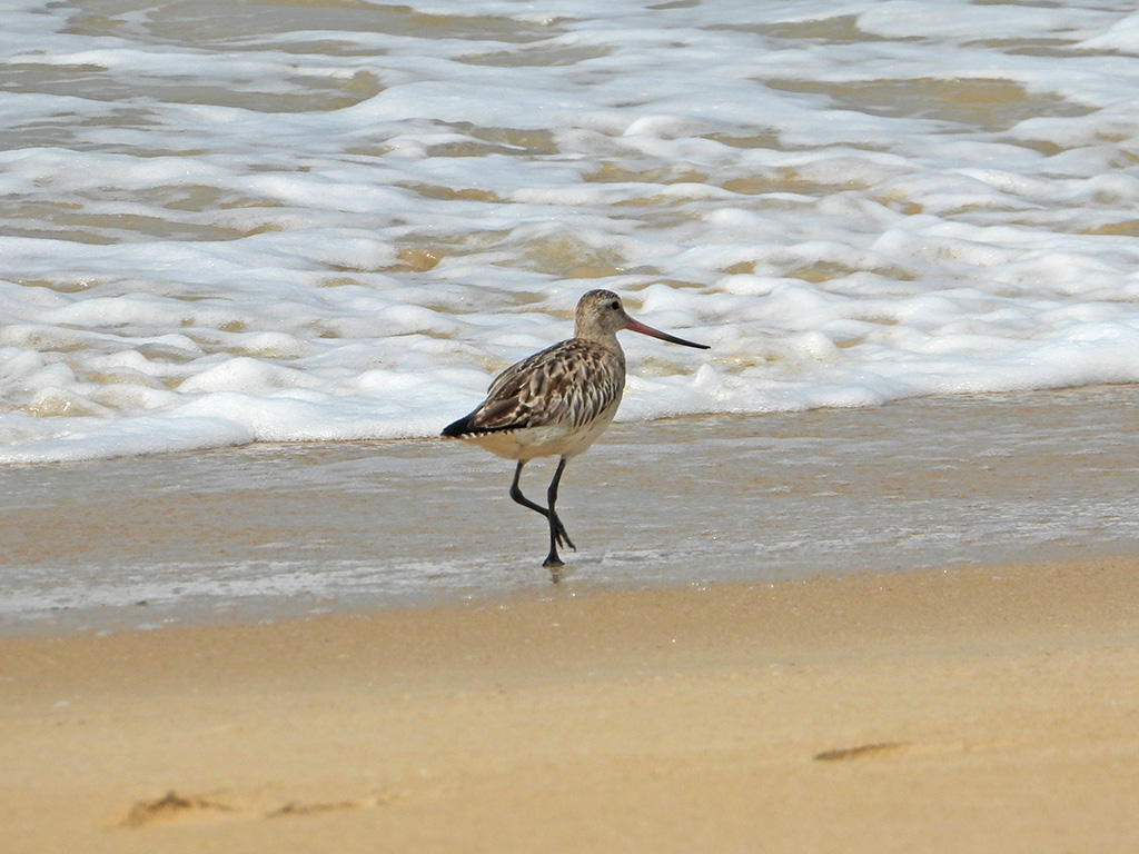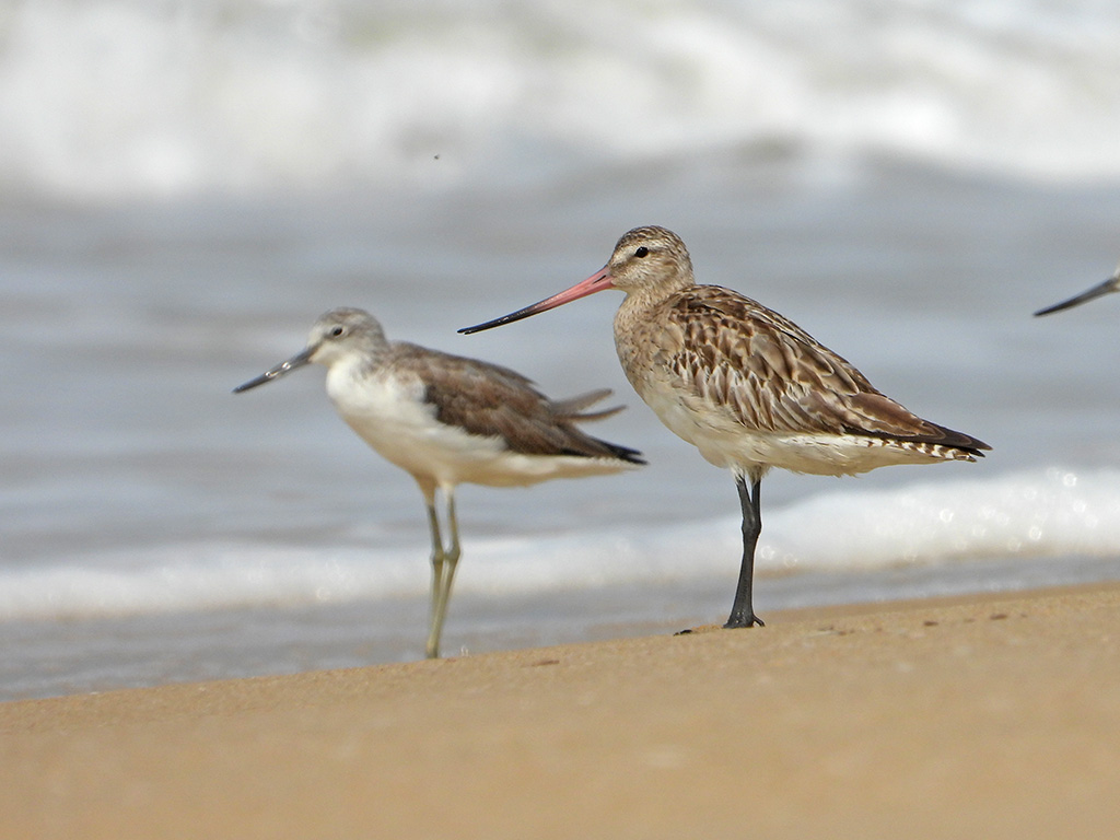 | Approximate size(adult): | A large wader measuring 37–41 cm in length, with a wingspan of 70–80 cm. It has a slightly upturned bill, barred tail, and long legs. Breeding plumage shows reddish-brown underparts, while non-breeding plumage is greyish-brown above and white below. Females are generally larger than males.