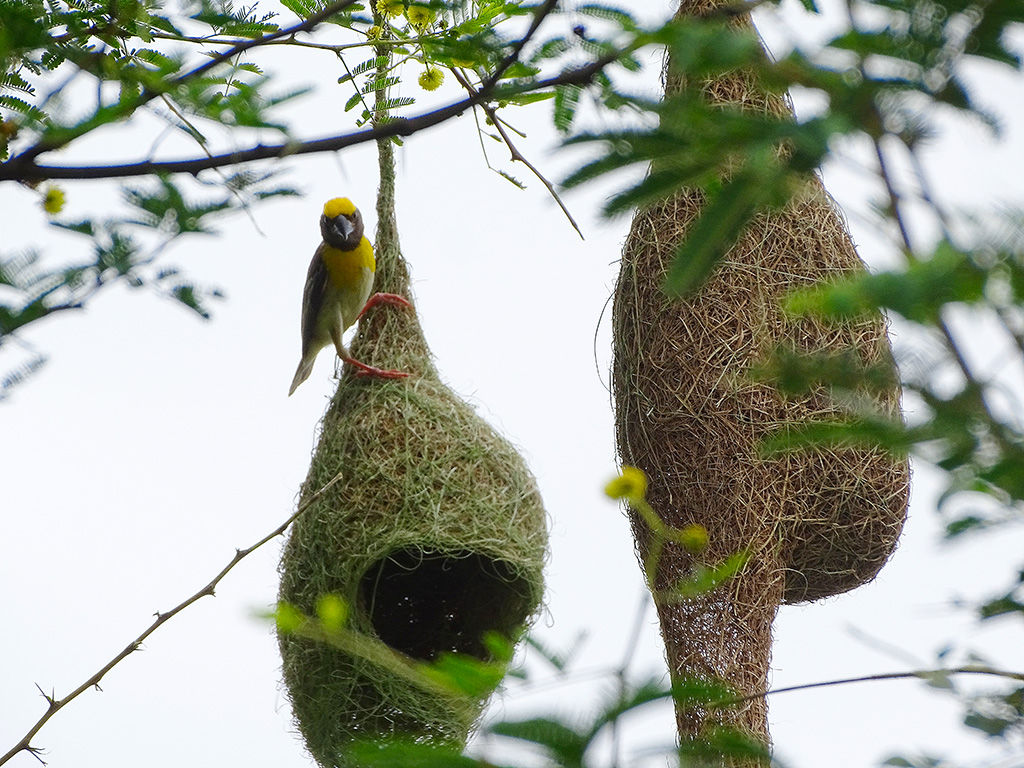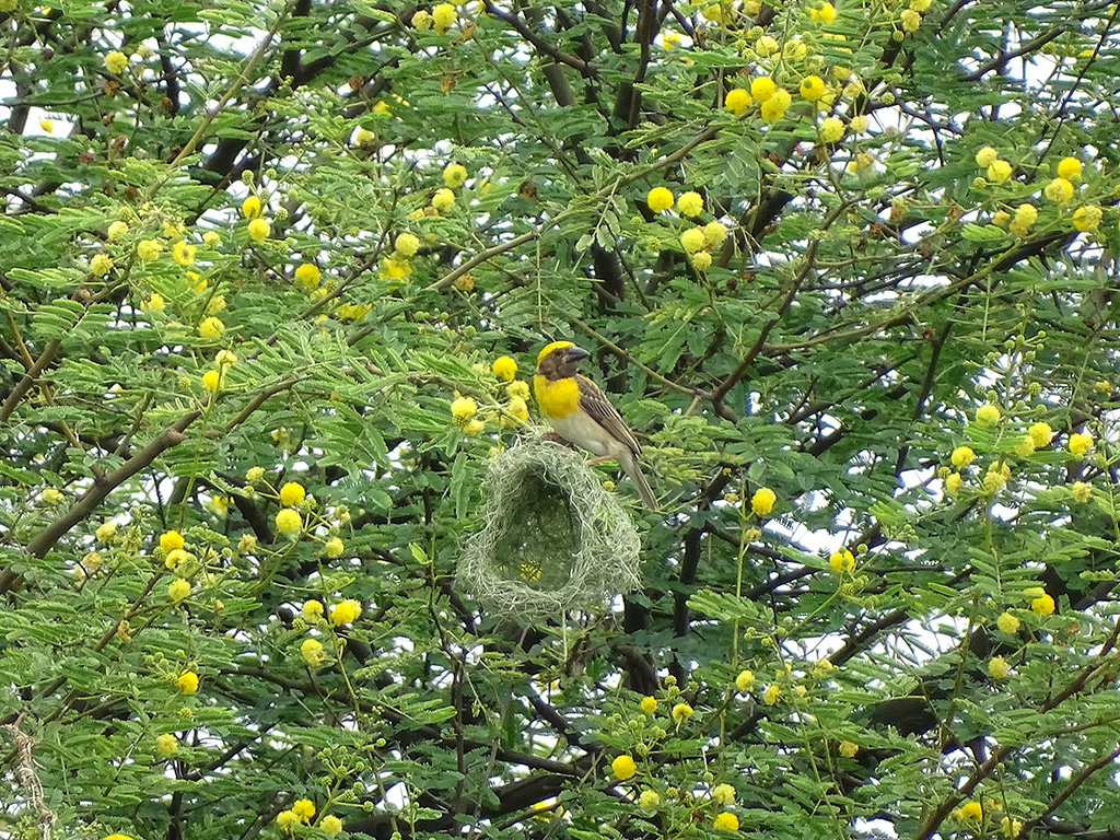 These colonies were found while heading towards the Jayamangali Black Buck Reserve in Karnataka. Suddenly, my attention was drawn to the roadside, where I saw multiple nests. Visually, it was stunning because the tree they had chosen for nesting also bloomed with yellow flowers. The birds were in their breeding plumage, and together, it looked incredible. Sometimes, I wonder if it is truly justified to call them weaver birds.