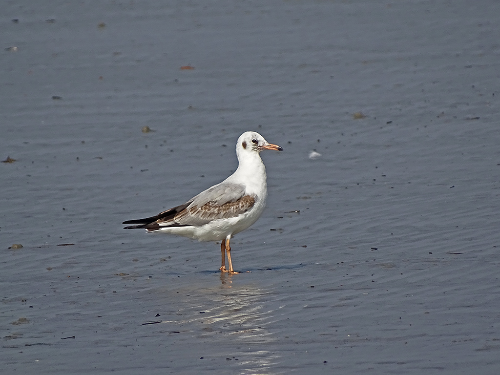 | Approximate size(adult): | A medium-sized gull measuring 34–37 cm in length with a wingspan of 94–105 cm and weight around 200–400 g. It has a chocolate-brown head in breeding plumage (appearing black from a distance), pale grey upperparts, and white underparts. In winter, the head turns white with a dark ear spot.