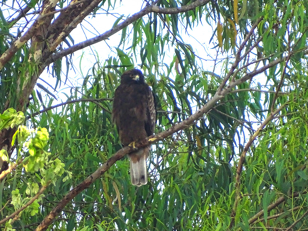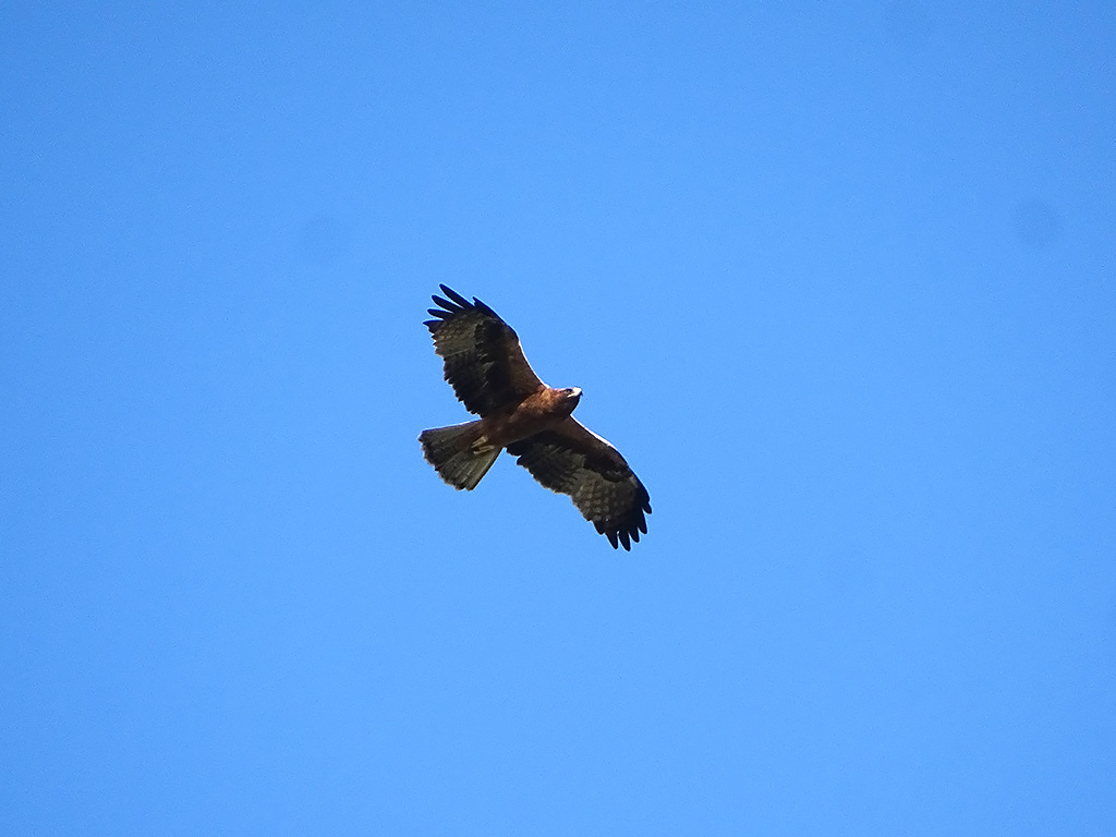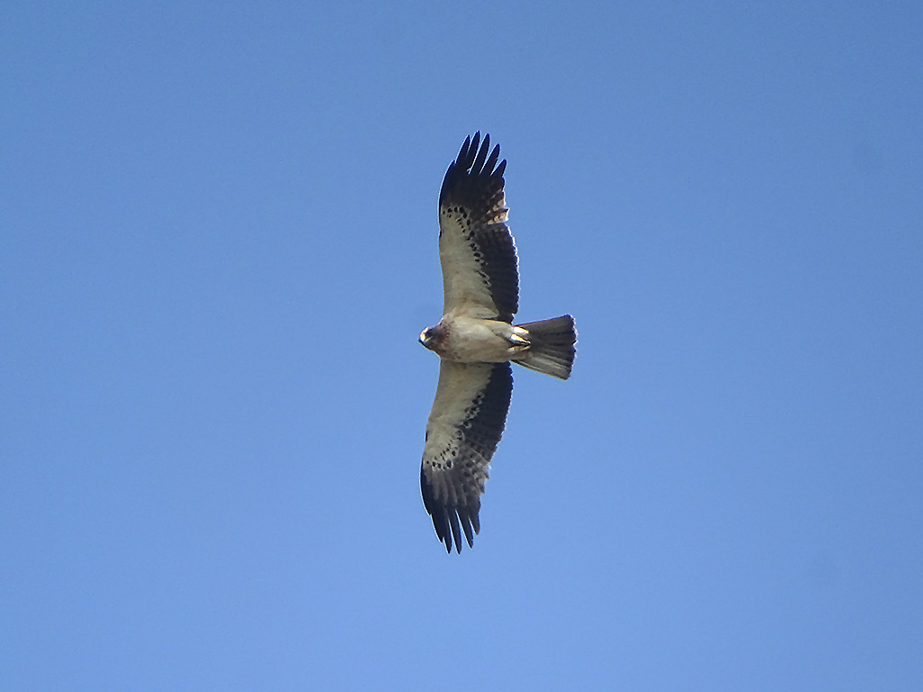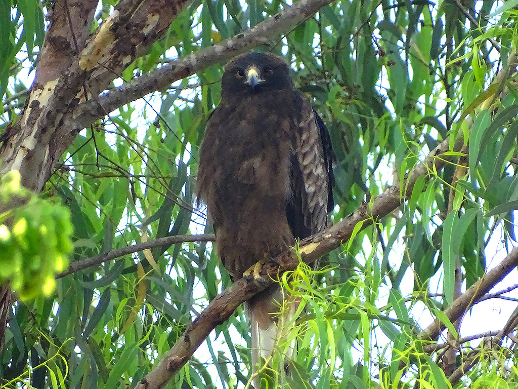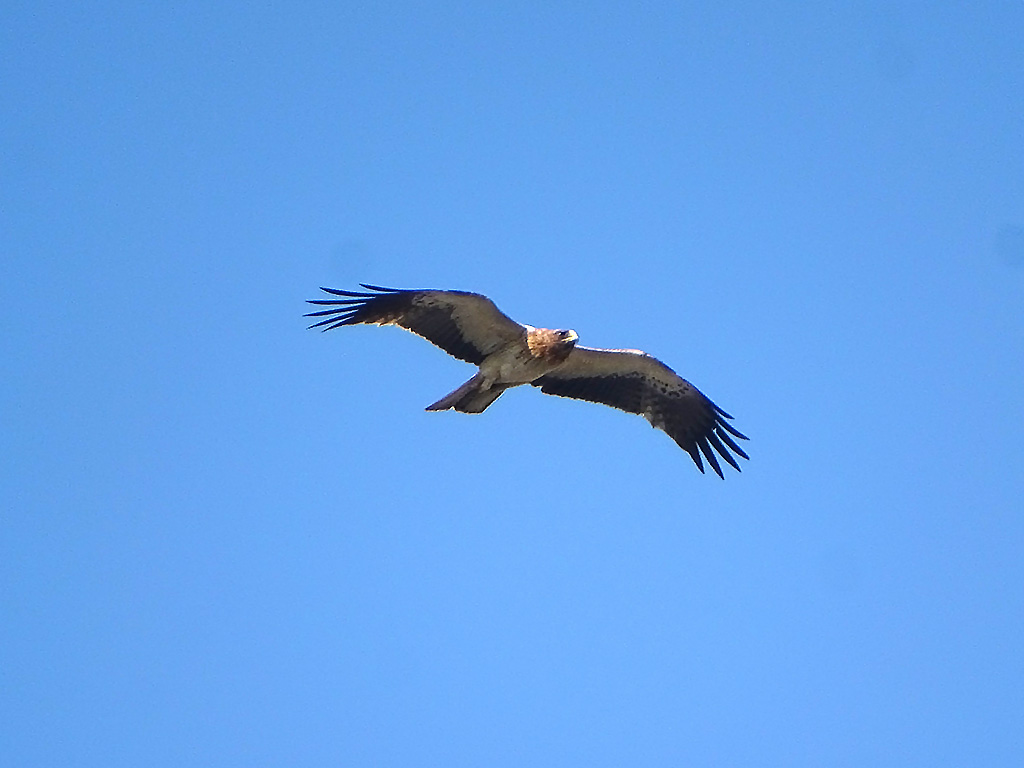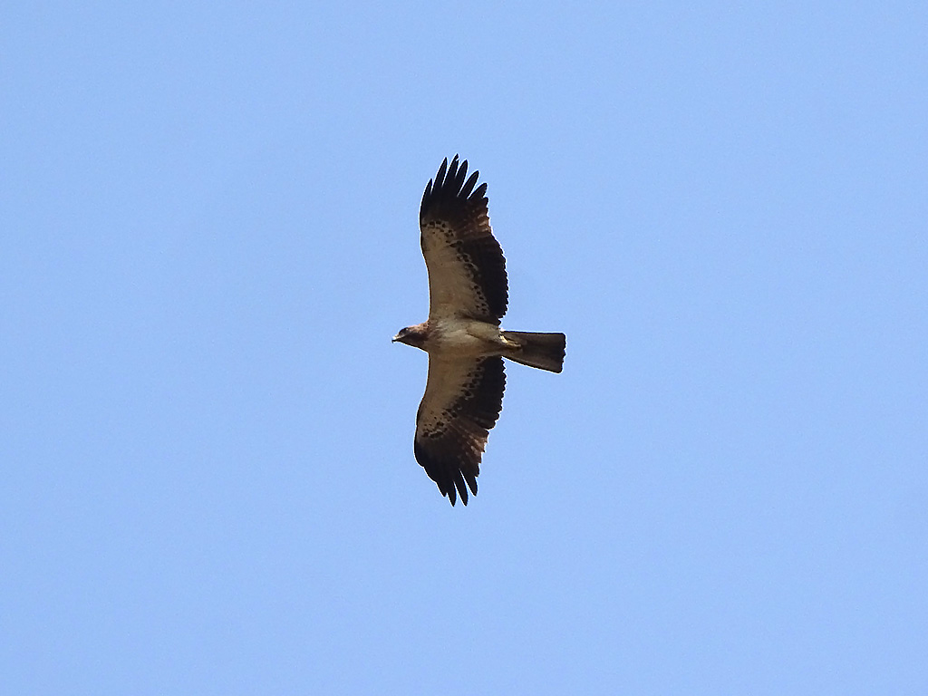 | Approximate size(adult): | Medium-sized eagle, about 45–53 cm in length with a wingspan of 110–135 cm. Exhibits two color morphs — light morph with pale underparts and dark flight feathers, and dark morph with uniformly dark brown plumage. Both morphs have feathered (“booted”) legs.