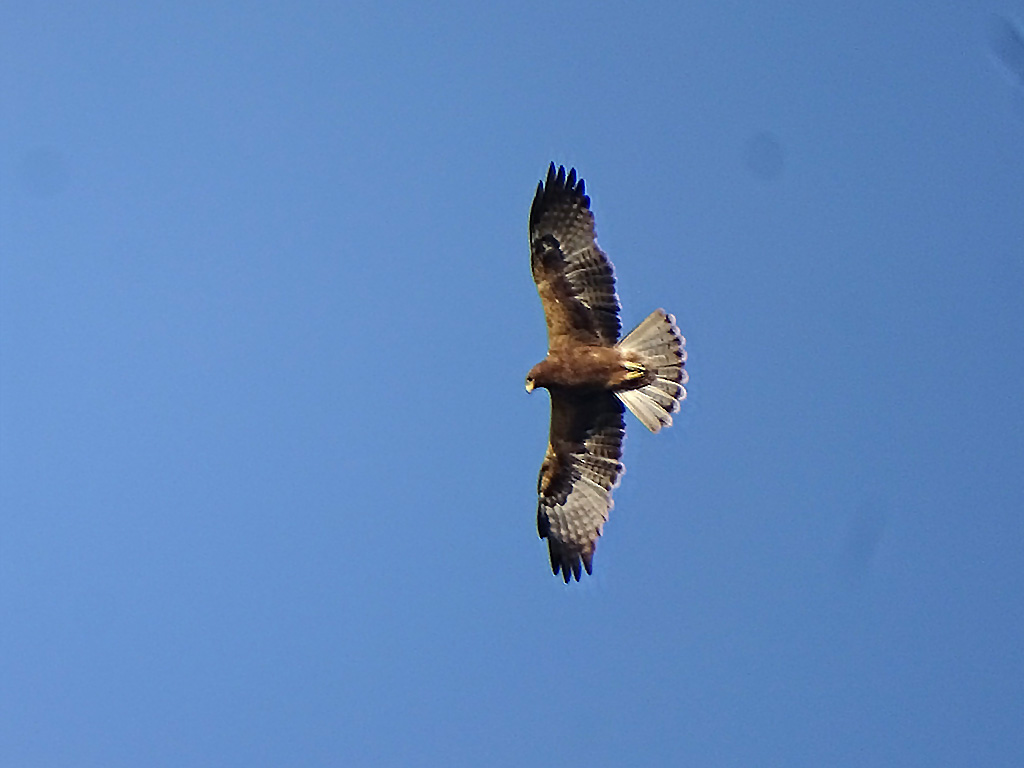 | Habitat: | Found in forested hills, open woodlands, dry scrublands, and plains during migration and winter. Often seen soaring or gliding high while hunting.