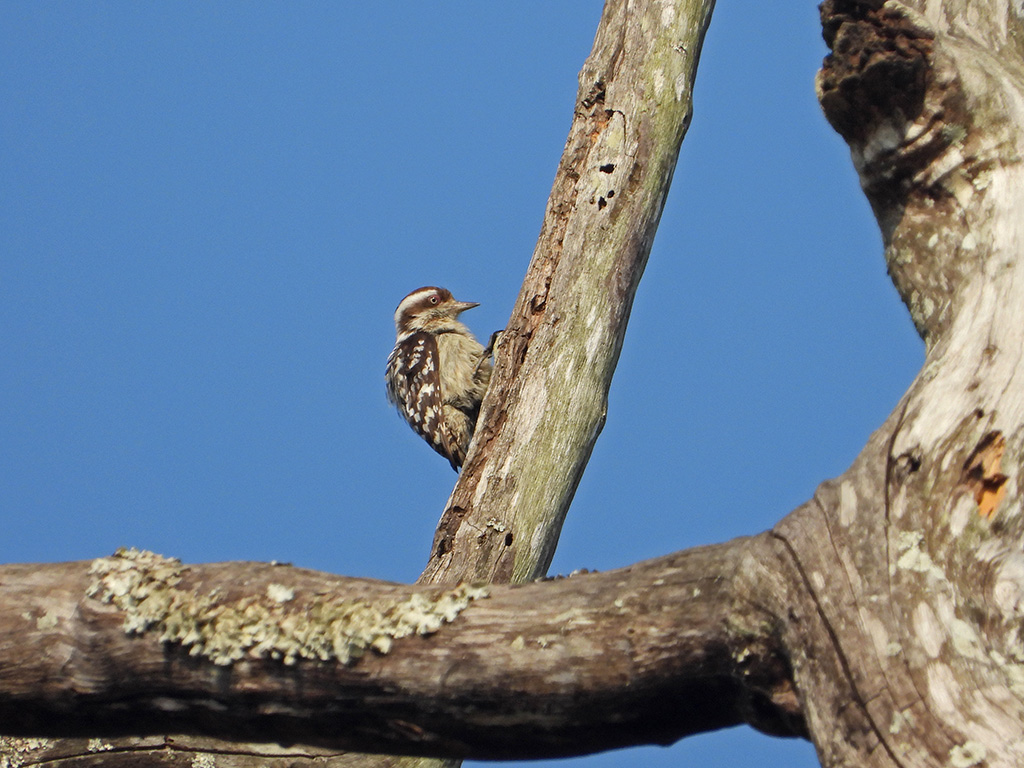 A woodpecker obviously can't stay calm, but luckily, sometimes it stays still on the tree and looks at the same spot of wood. I wonder what it actually thinks at that time. Its brown head is clearly visible, and it is a fearless bird. One can get a very good picture of it, as it doesn’t move around bushes but stays on a bare tree.