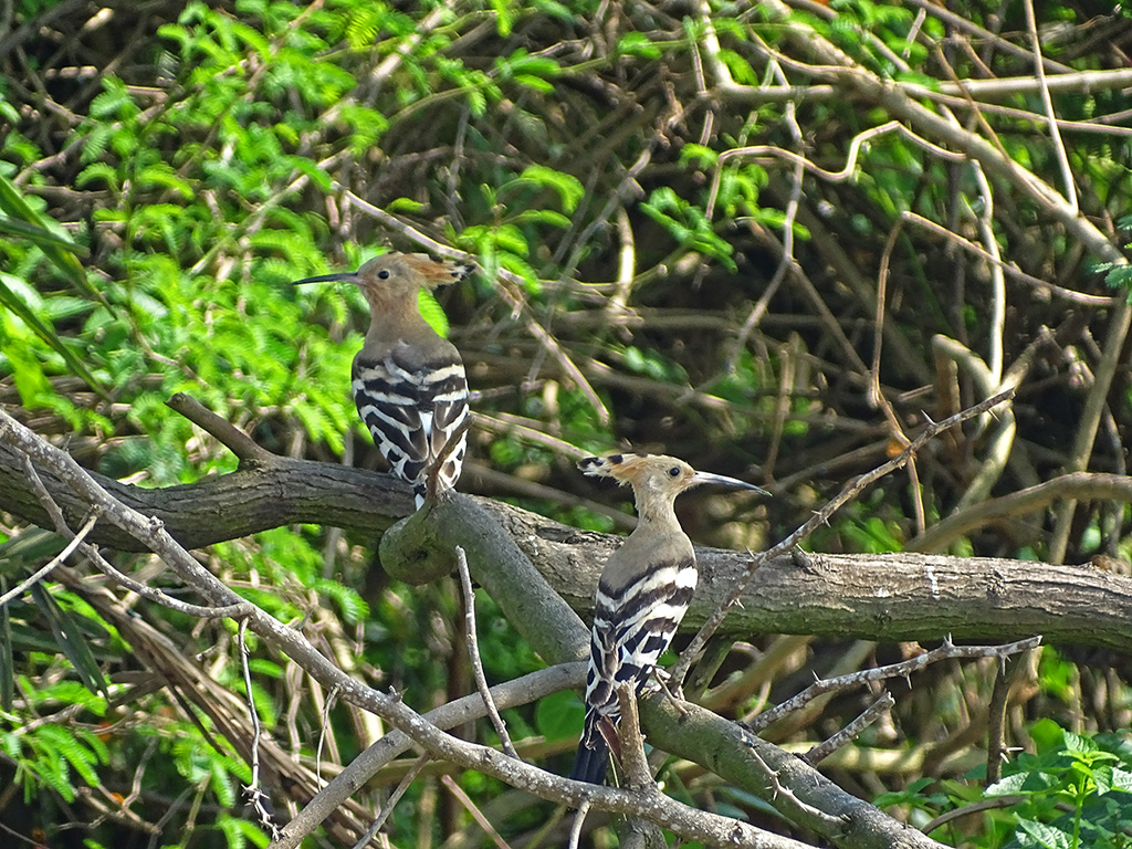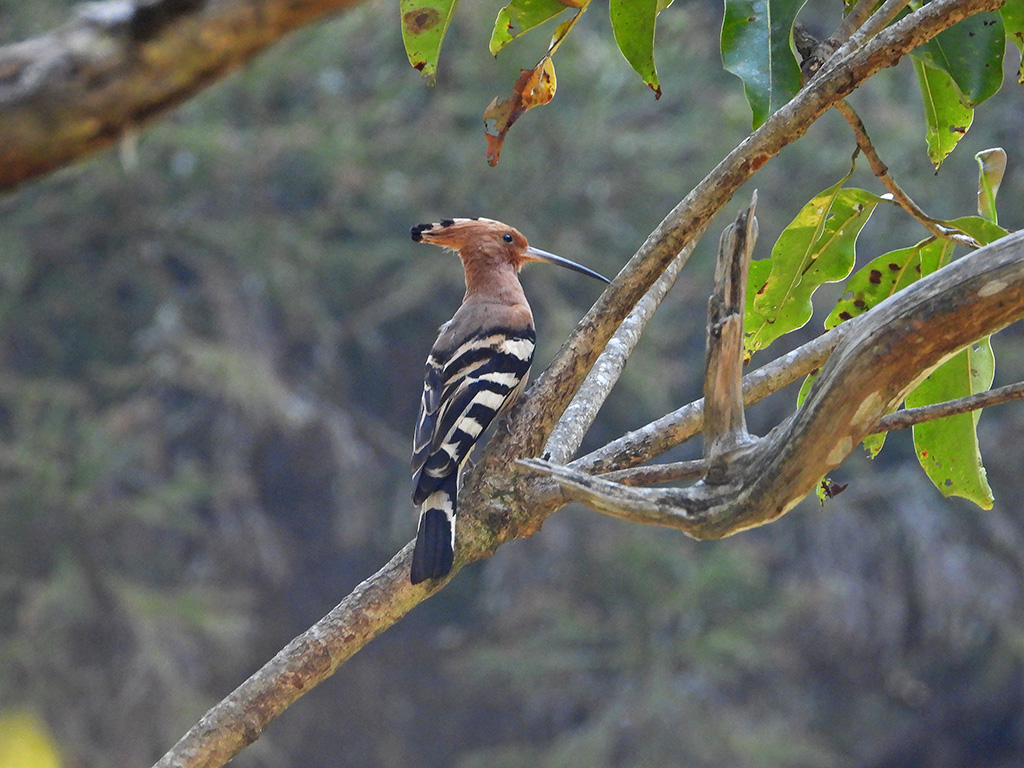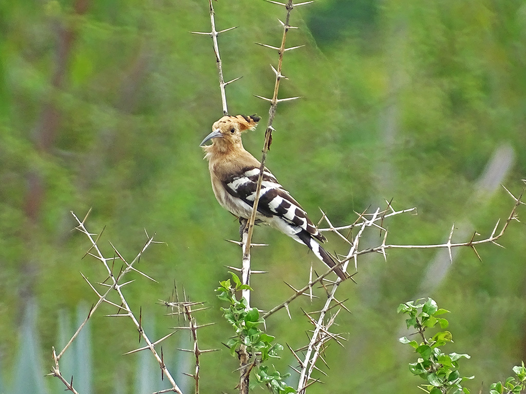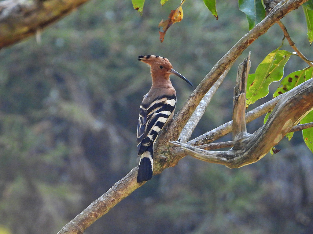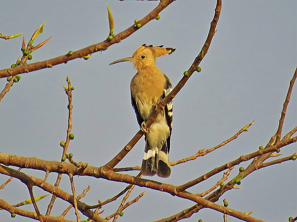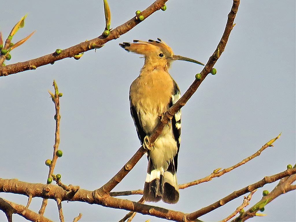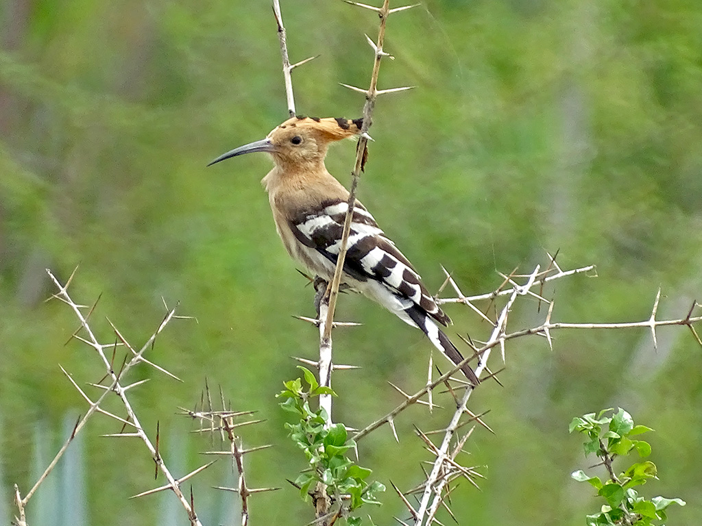 | Approximate size(adult): | Length about 25–32 cm; wingspan 44–48 cm; weight around 50–90 g. Medium-sized bird with a distinctive orange-brown crest tipped black, long down-curved bill, and striking black-and-white barred wings.