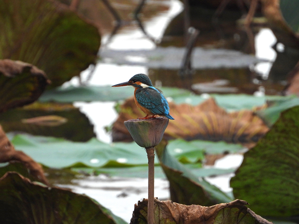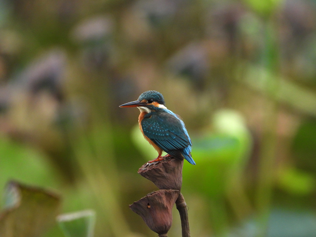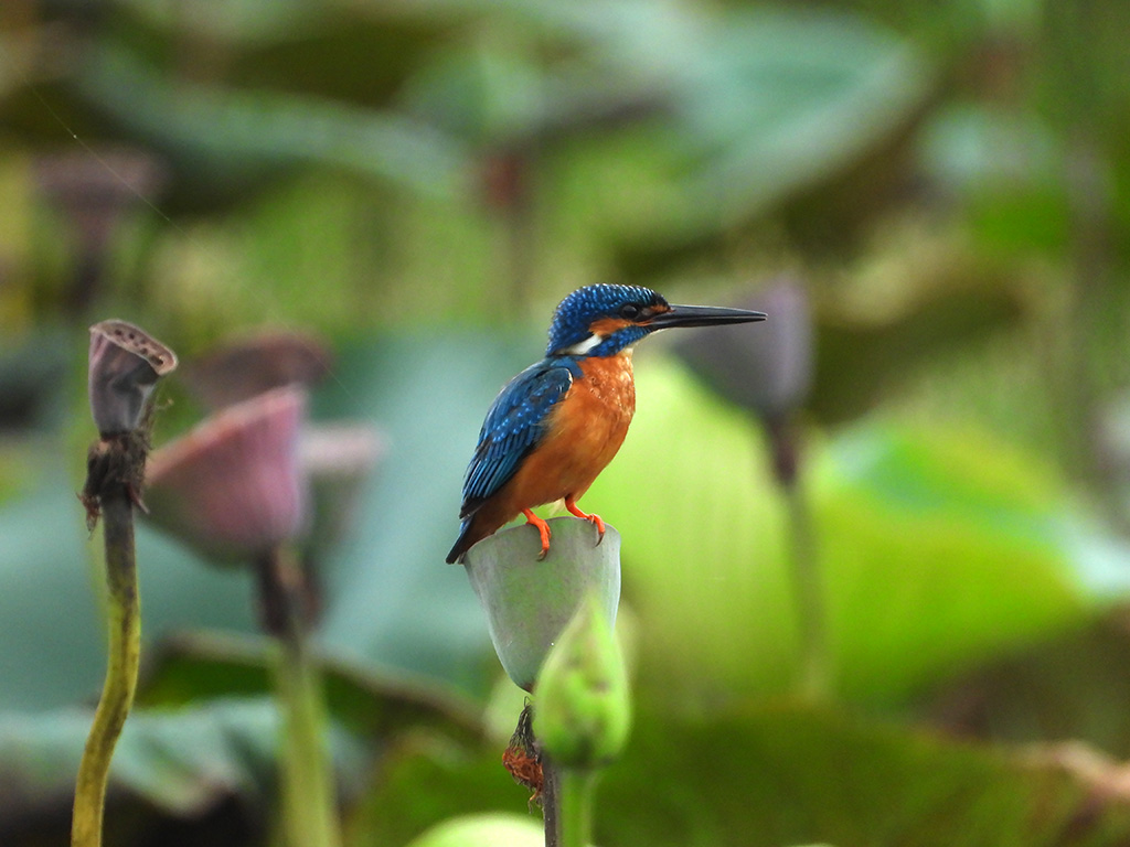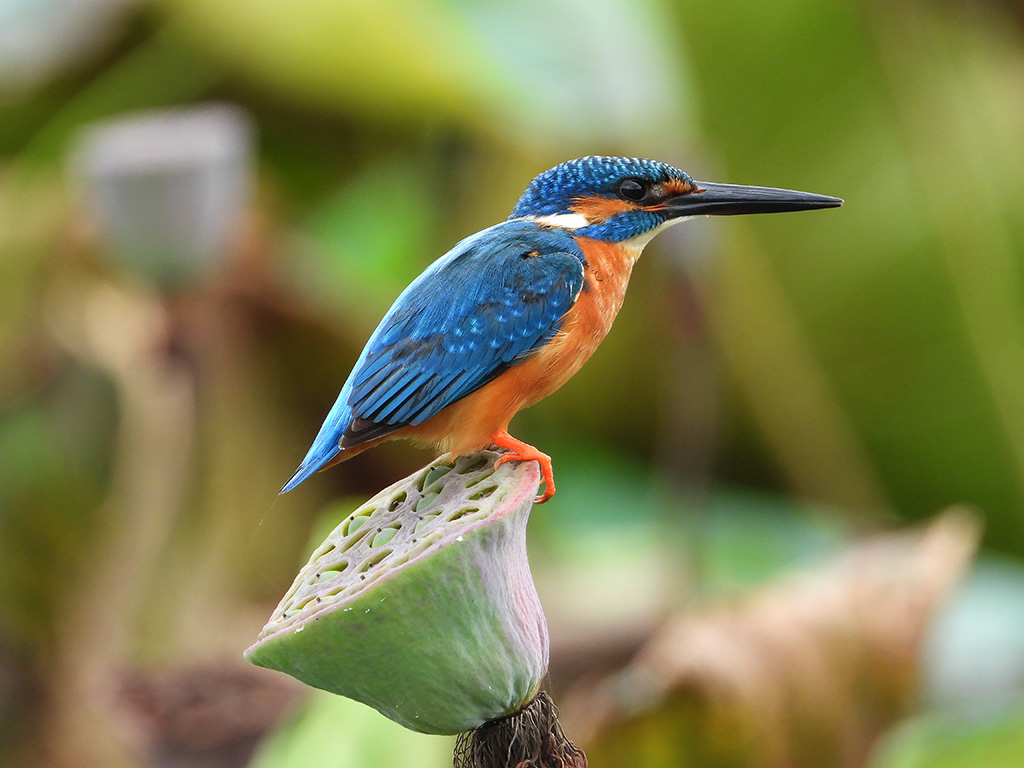 | Approximate size(adult): | Length about 16–17 cm; wingspan 25 cm; weight around 30–40 g. A small, brilliantly colored kingfisher with bright blue upperparts, orange underparts, and a long, sharp black bill. The blue back glows iridescently in sunlight.