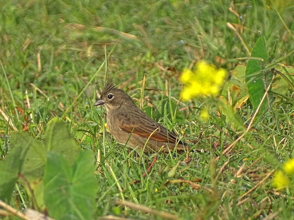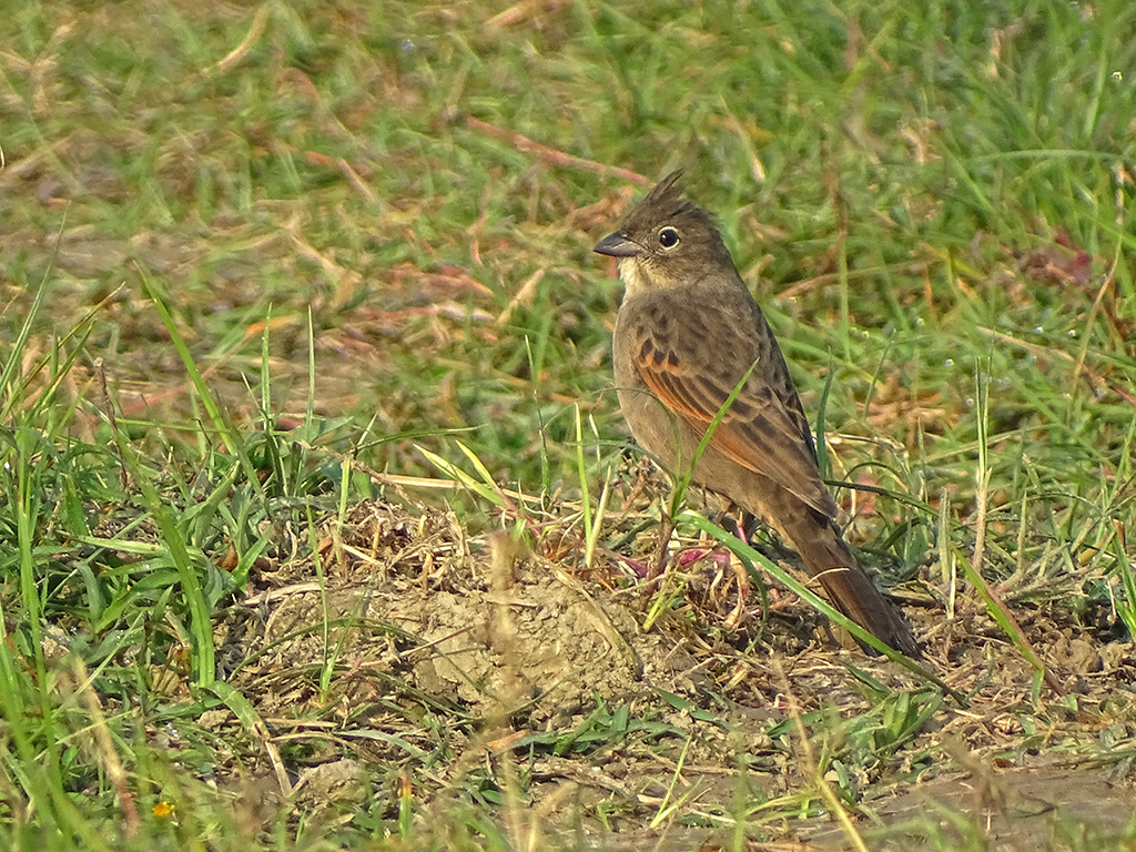 It was a field where they used to cultivate mustard. There were a few abandoned fields as well. In some areas, they cultivated other crops. While searching for a blue-throat, I suddenly saw a small bird hopping on the ground. It was so small that it was difficult to observe clearly. At first, I thought it was a blue-throat, but then I noticed the missing throat band. Suddenly, it noticed me and raised its crest. That’s when I recognized it as a female crested bunting. I was worried that if it flew away, I wouldn’t be able to find it again, so I crawled and tried to approach it. It was about 20 feet away from me and kept moving further as I tried to get closer. However, it didn’t fly away since it wasn’t disturbed or scared. While foraging, it didn’t stay in one place and kept moving around. These were the pictures I managed to capture that day. I was happy to spot a lifer, even though at the time, the concept of a lifer was very new to me—I didn’t even know what it meant.