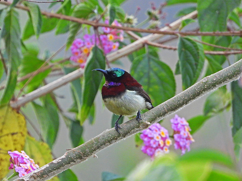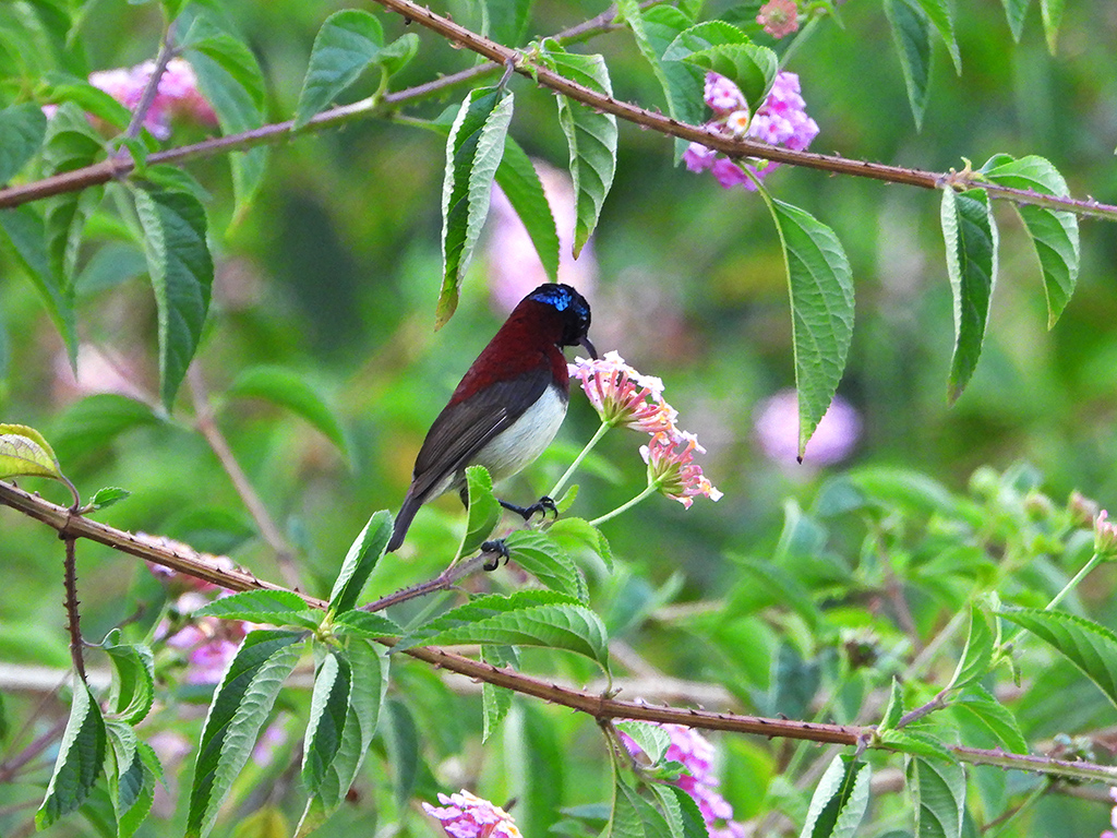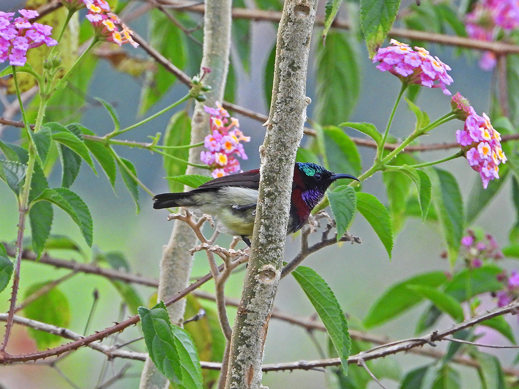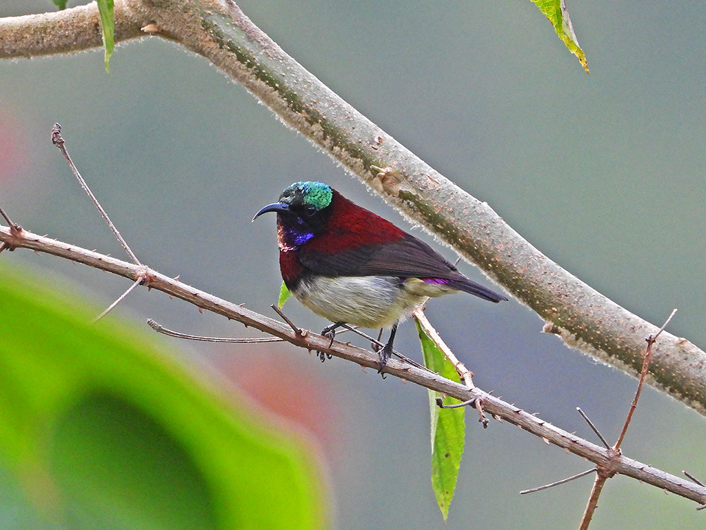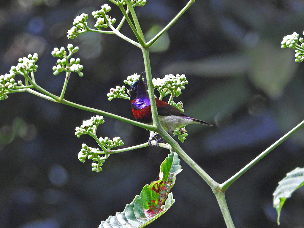 | Approximate size(adult): | Length about 8–10 cm; weight ~6–8 g. A tiny, vibrant sunbird with crimson back and rump, metallic green crown, purple throat, and olive-brown wings. Females are olive-brown above and yellowish below. Has a short, down-curved bill.