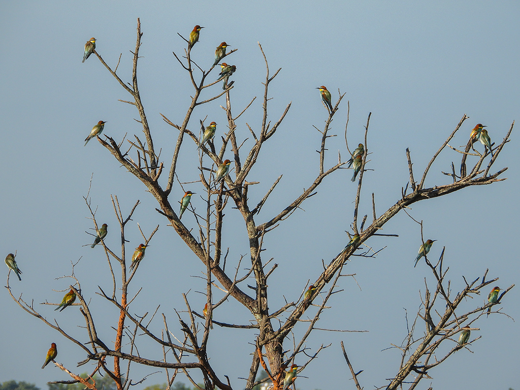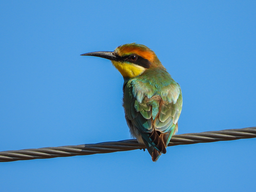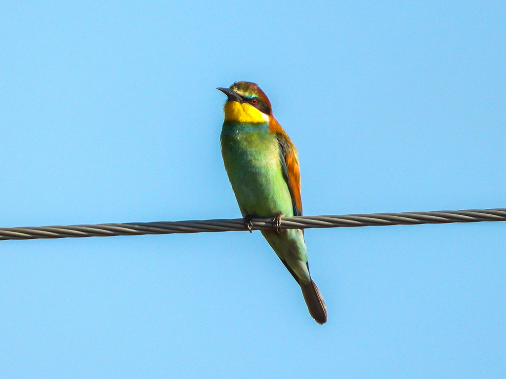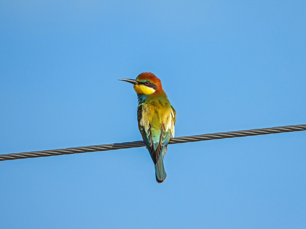It was an amazing experience to witness this beautiful species in such large numbers. At first, I couldn’t believe my eyes. These birds are so vibrant in color, and their feathers shine even more in the sunlight. Their behavior is very similar to other bee-eaters, but their unique color combination sets them apart. In the mornings, they would chirp all over the grassland, fly around, perch on wires, and hunt insects or bees mid-air. It was such a treat for the eyes to watch the spectacle.
