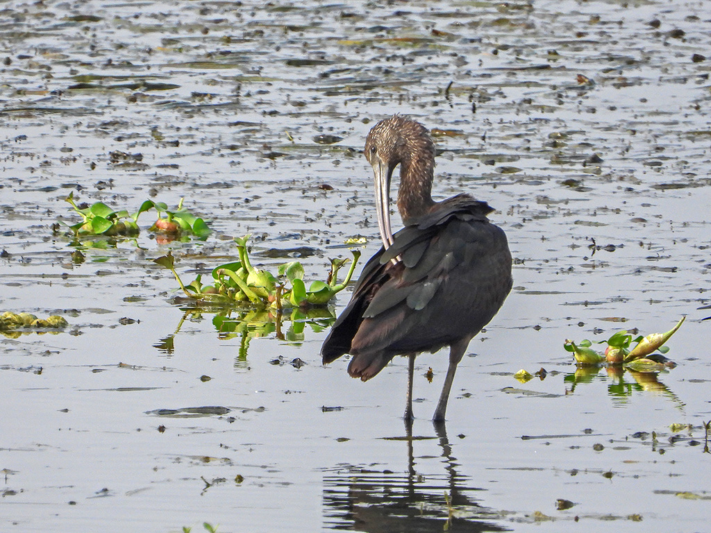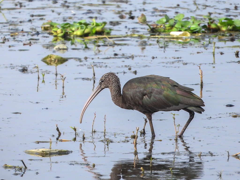 | Approximate size(adult): | Medium-sized ibis about 55–65 cm long, with a wingspan of 88–105 cm and weight ranging from 485–525 g. Slender body, long decurved bill, and glossy plumage with bronze, green, and purple sheen.