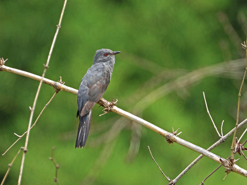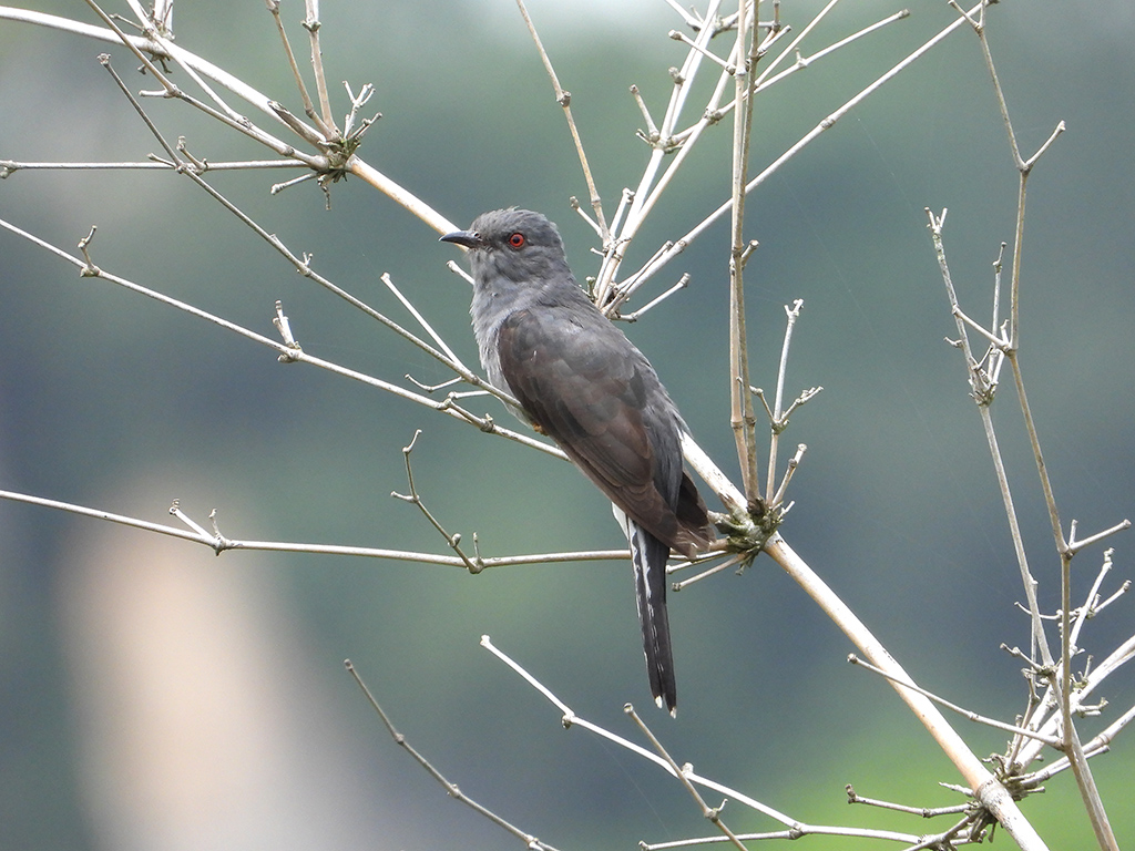 A very common cuckoo is found throughout Karnataka, but I am unfortunate not to encounter it very frequently. I mean, I could have had more records than I currently do. Anyway, it is a beautiful, greyish male bird with red eyes, mostly found in hilly jungles or near lakes because it primarily feeds on caterpillars found in such areas. It is usually identified by its distinct and loud calls echoing through its habitat.