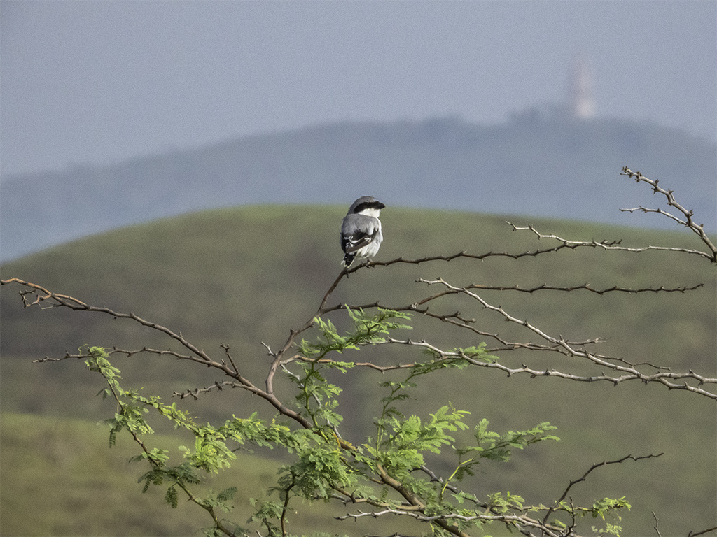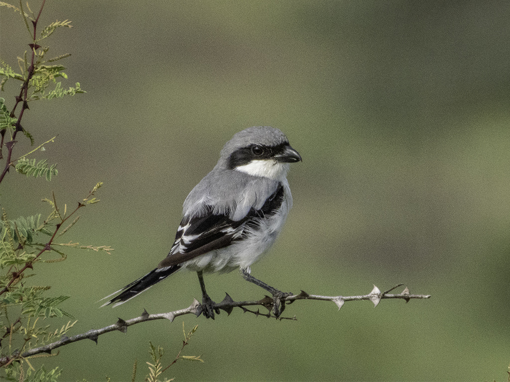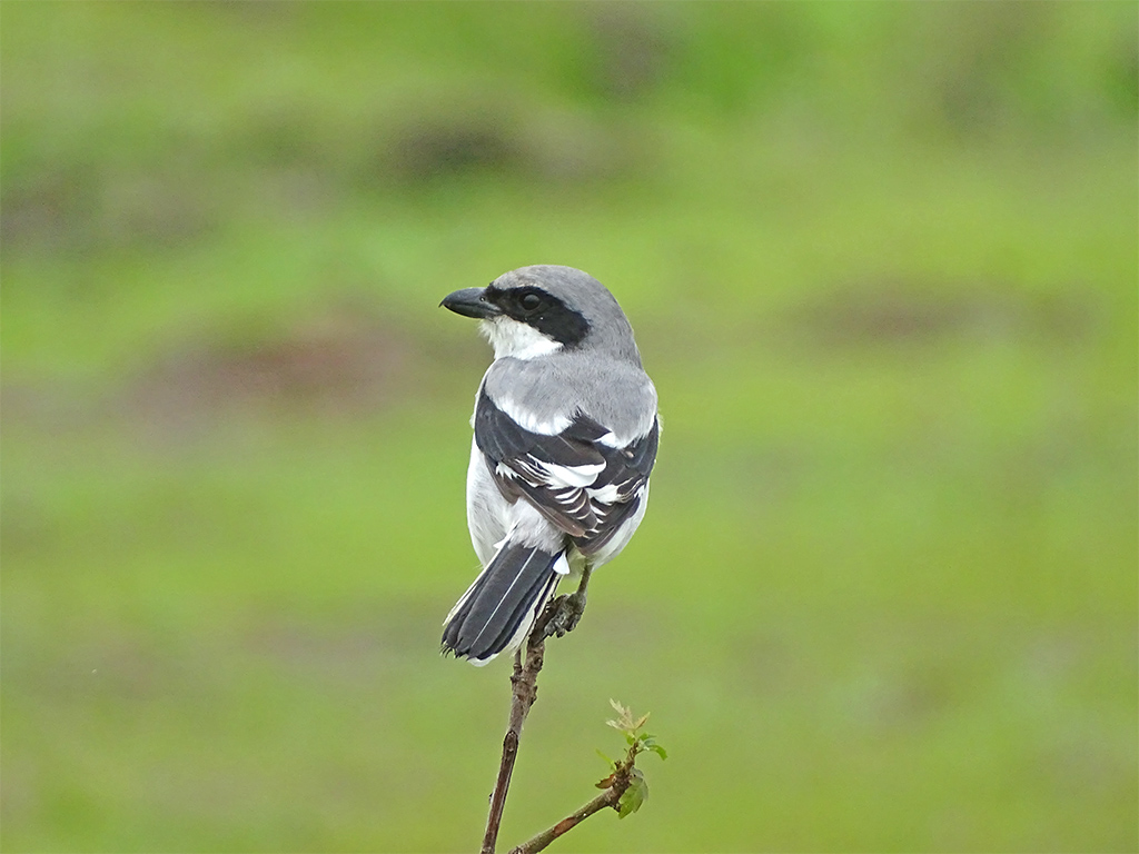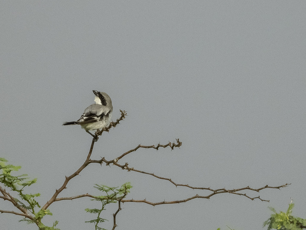 | Approximate size(adult): | A large shrike, measuring about 24–26 cm in length with a wingspan of 30–35 cm. It has a pale grey head and back, black mask, white underparts, and black wings with white patches. The bill is strong and hooked.