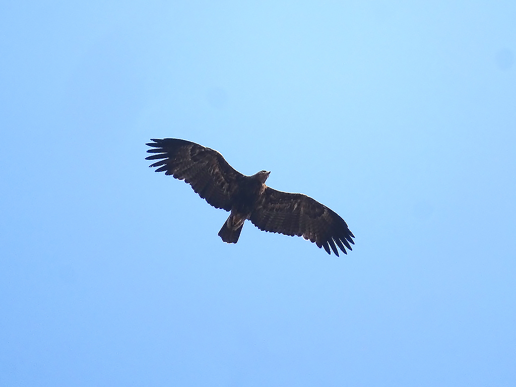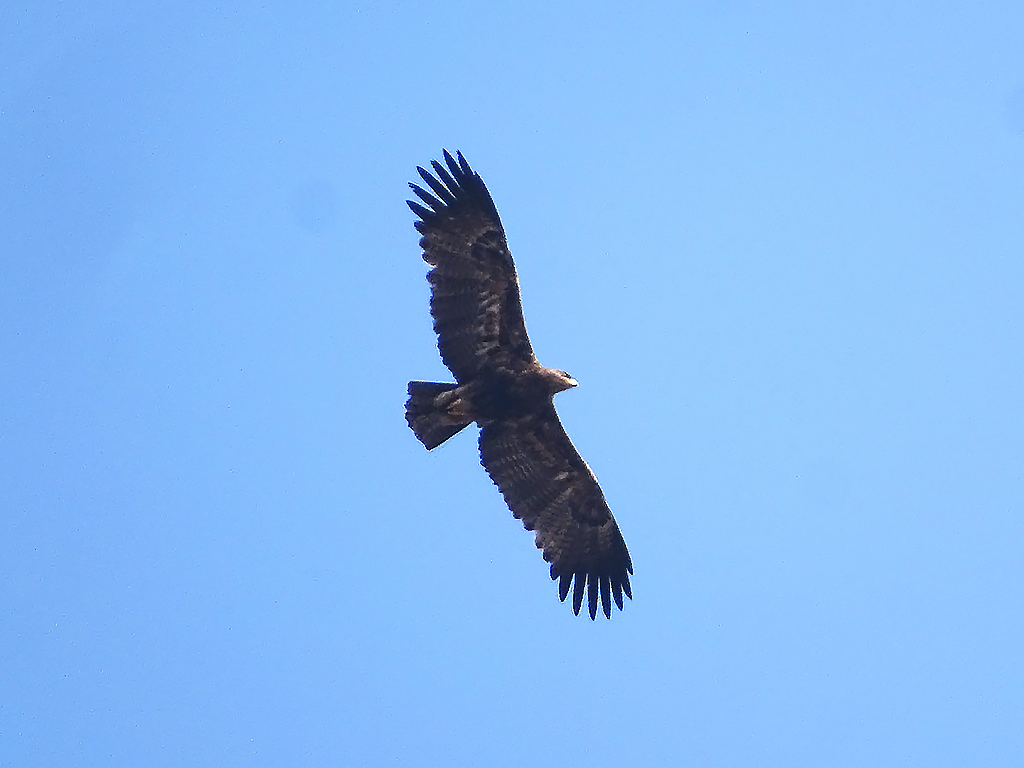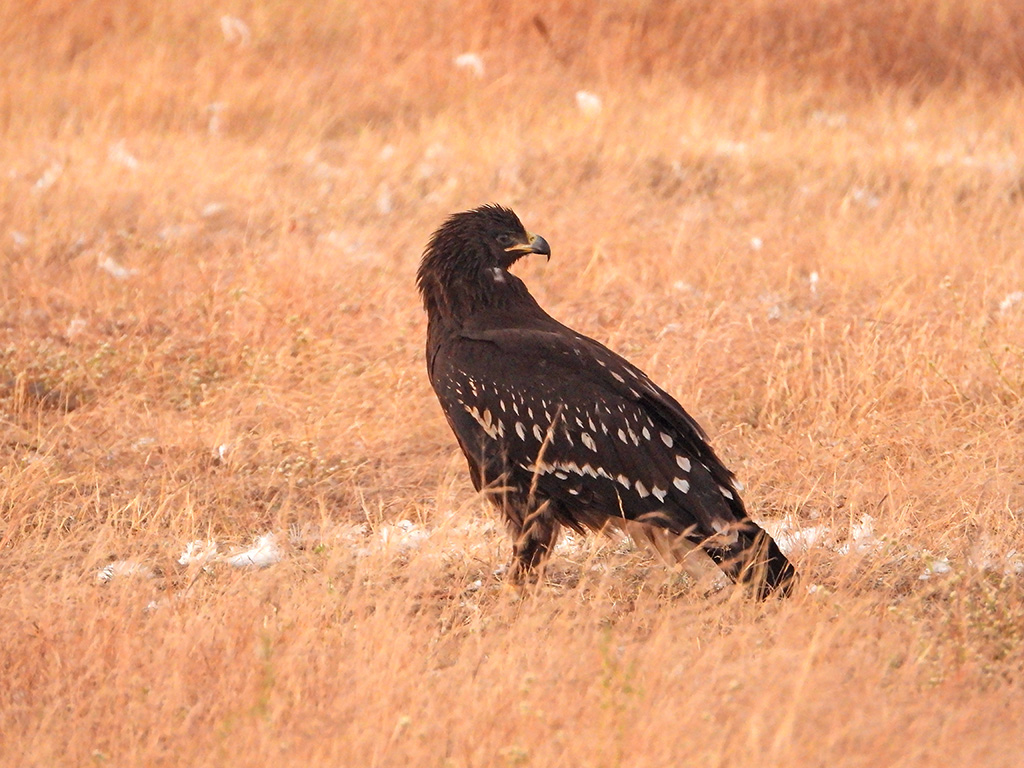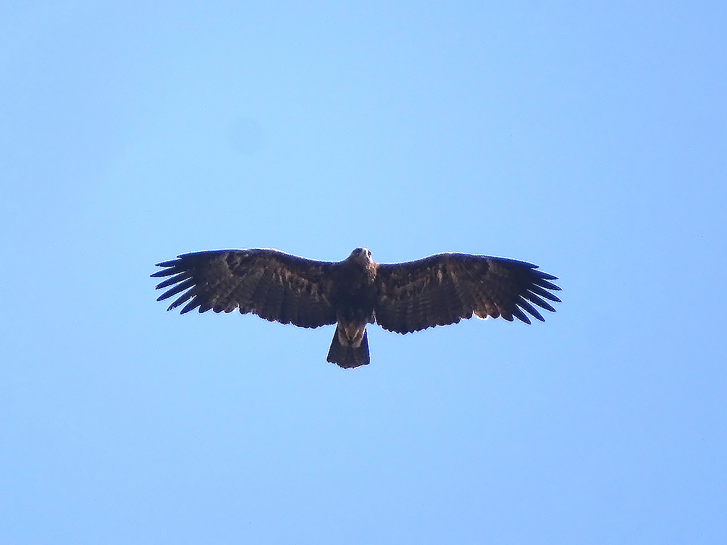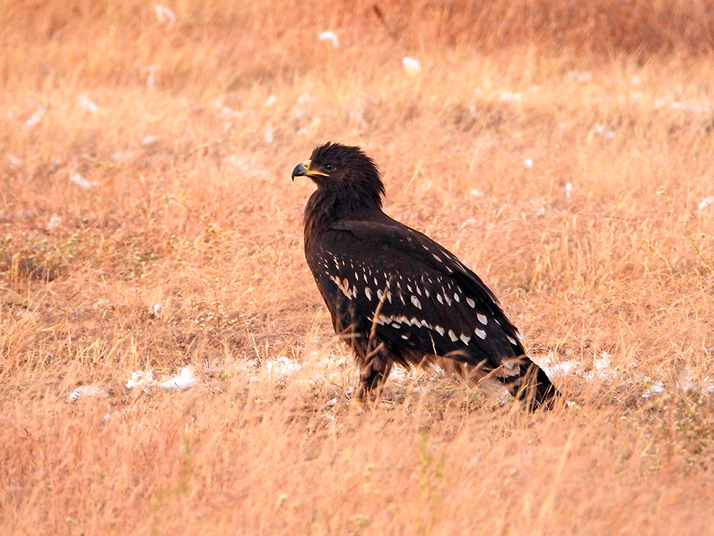 | Approximate size(adult): | A large raptor measuring 60–70 cm in length with a wingspan of 150–180 cm. Appears dark brown overall with lighter streaks on the upperparts and characteristic white spots on the wing coverts (“spotted” look). Juveniles show more distinct spotting than adults.