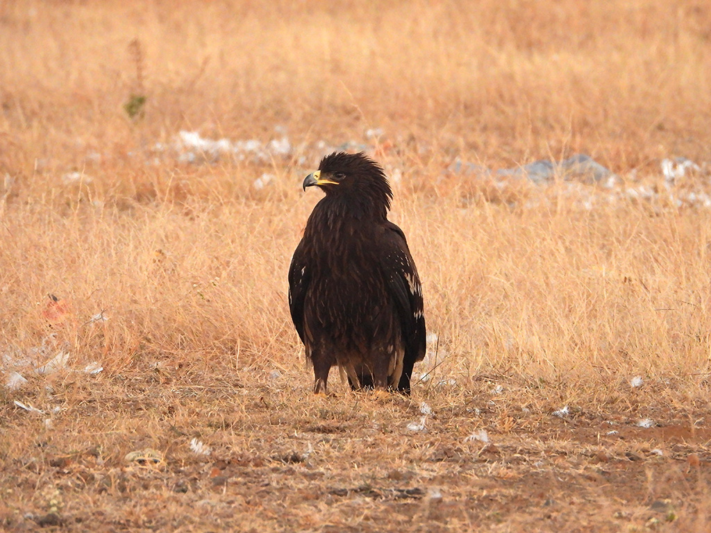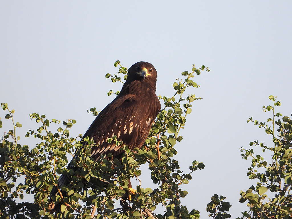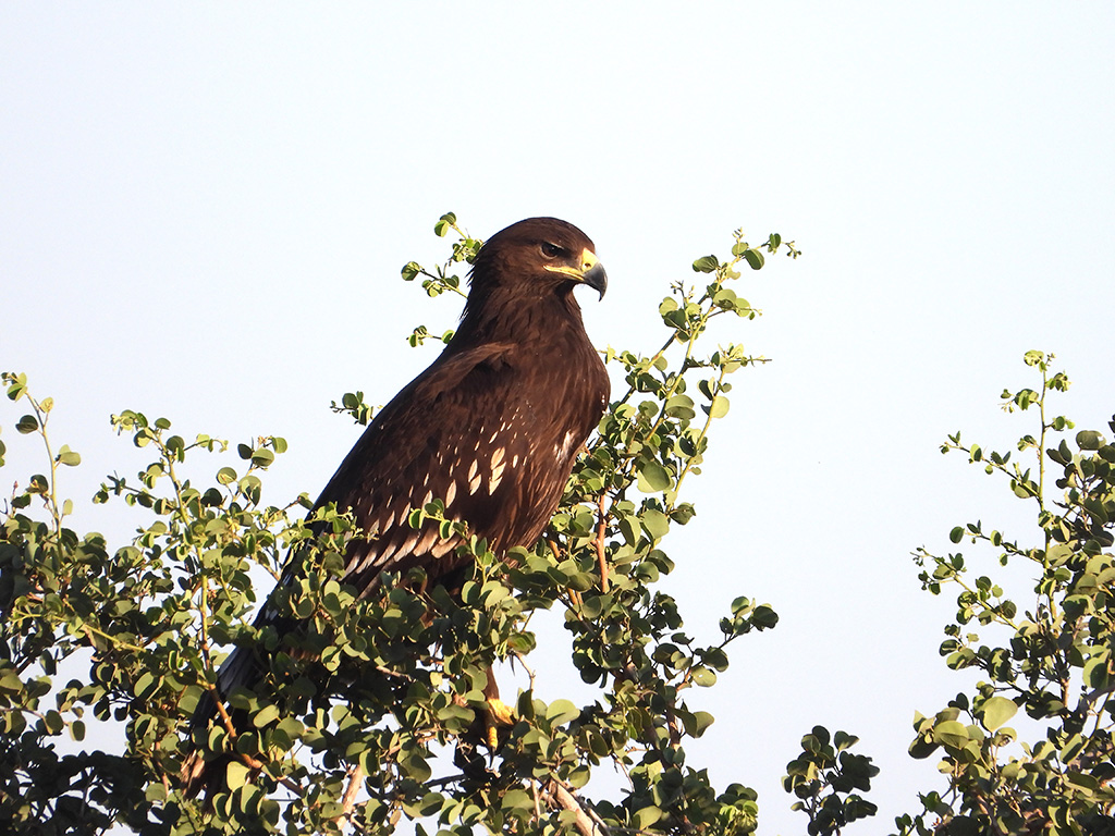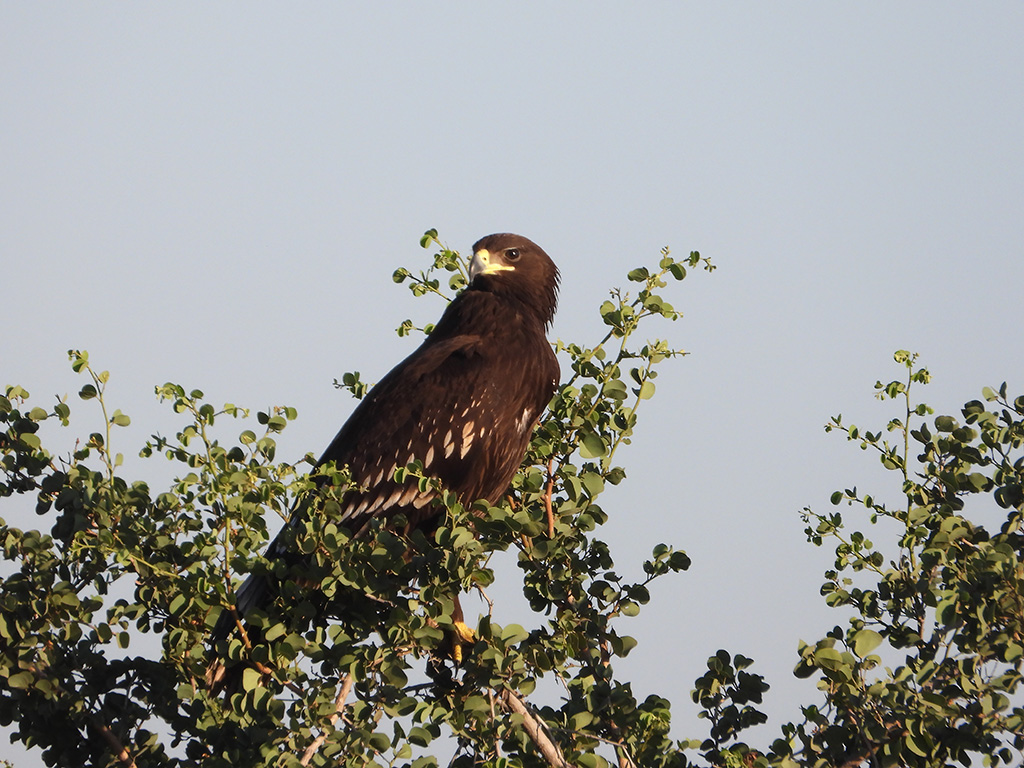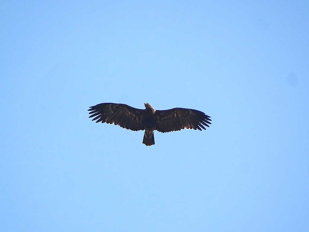 | Approximate size(adult): | A large raptor measuring 60–70 cm in length with a wingspan of 150–180 cm. Appears dark brown overall with lighter streaks on the upperparts and characteristic white spots on the wing coverts (“spotted” look). Juveniles show more distinct spotting than adults.