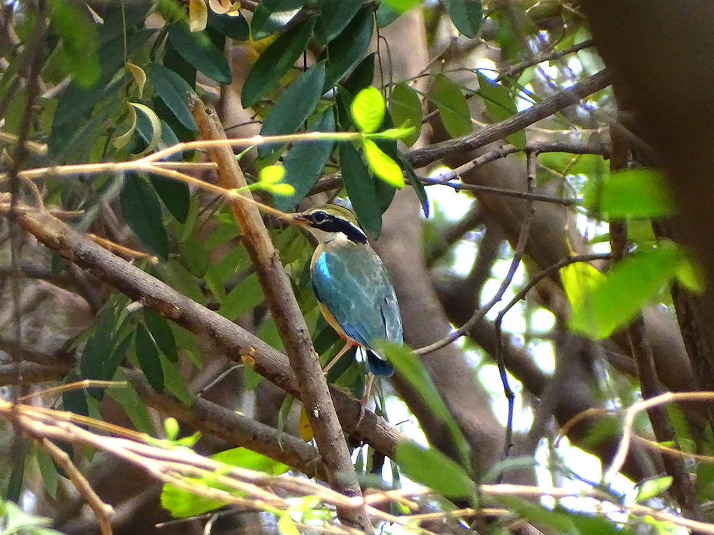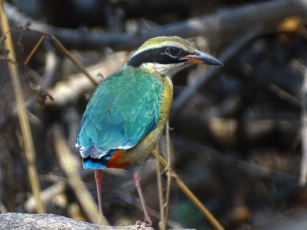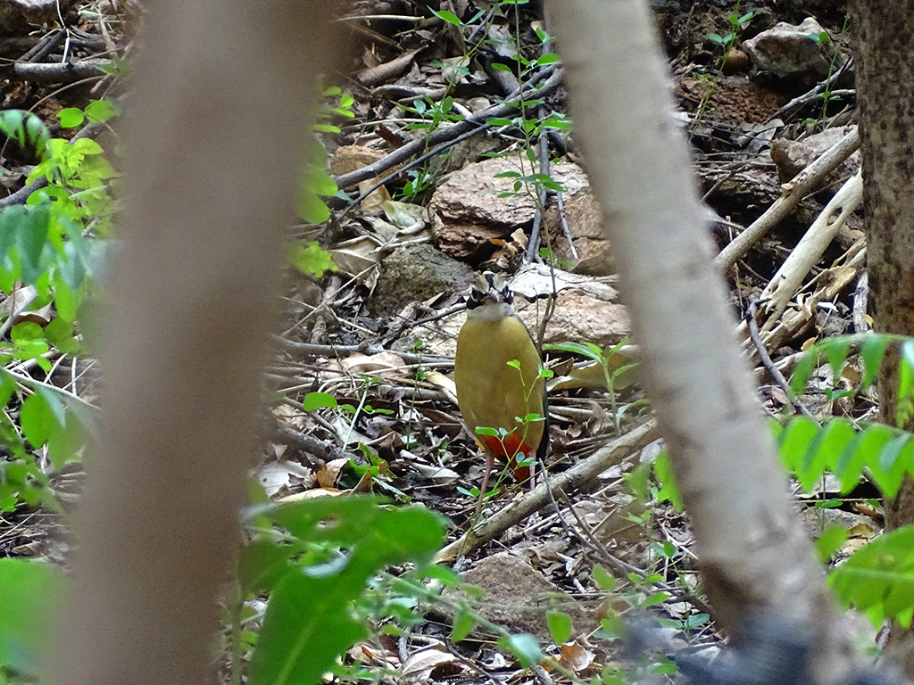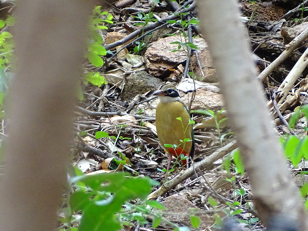 One of the most beautiful birds and probably every birder's favourite Indian pitta has total 9 colors in it's body. That's why it is called "Navrang" also. Colors present in its body are Black, White, Buff, Brown, Pink, Torque blue, Leaf green, Sky blue, Orange-red. In India we find it mostly from April to June, before monsoon it comes down to breed. This individual I have got in Pearl valley, there is a vast bamboo forest area. It was very shy in behaviour, generally it is not a very shy bird in many other places I have seen before. After trying for 3/4 days I managed to capture this pictures from my old camera.
