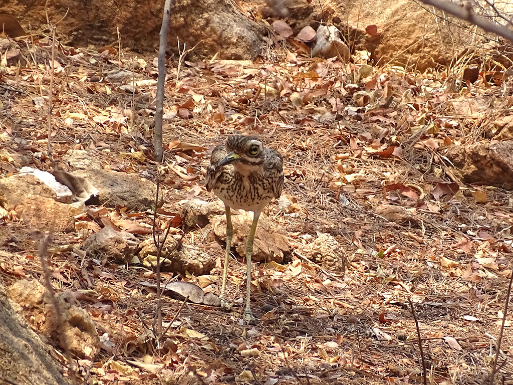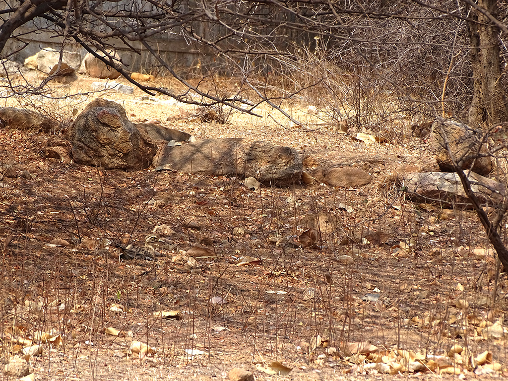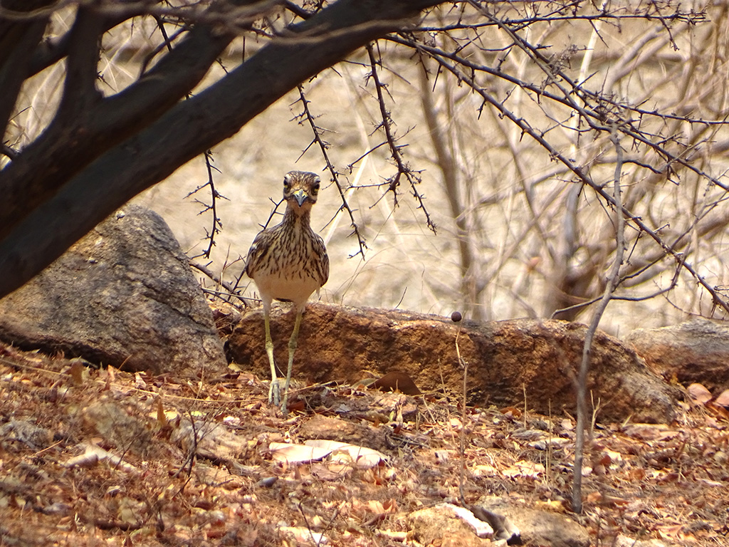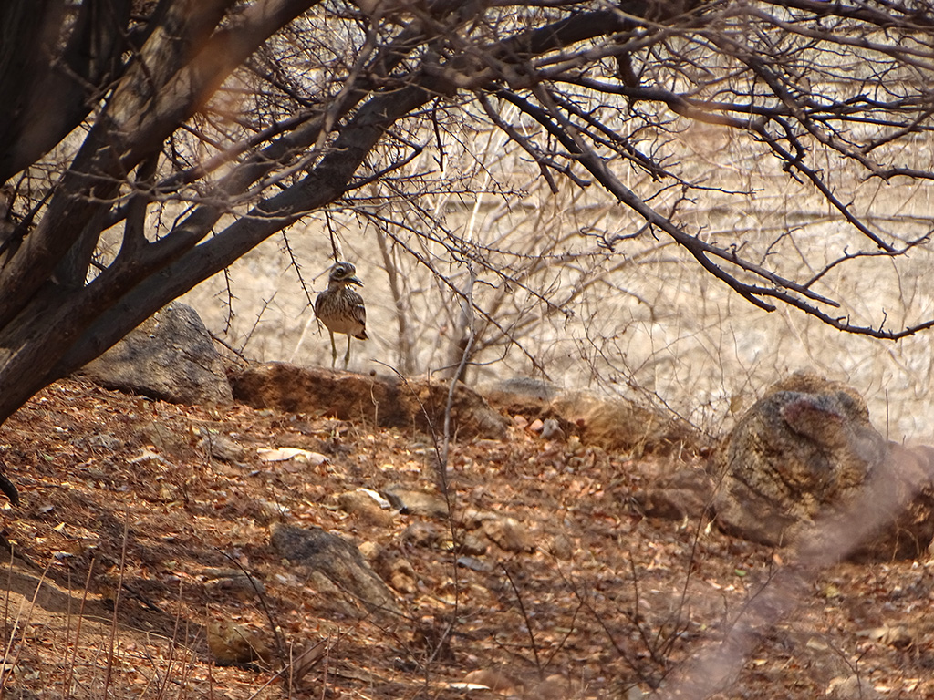 Just as we were almost done with birding, while returning, I asked Pampayya Sir if we could see the Indian thick-knee. He drove us to a dry roadside area and looked for it from the car. He was so confident we would find the bird, but the only challenge was its camouflage. When he spotted it, I was incredibly excited and tried to find it on my own, but I had no luck. Then he pointed it out with a laser and showed us.