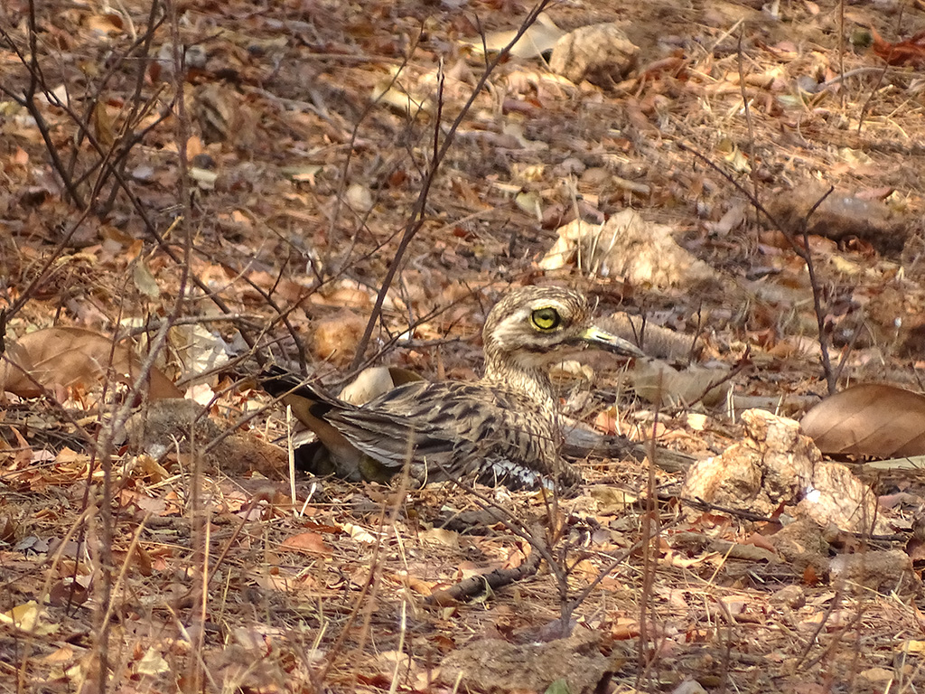 Oh boy, it was such a delightful experience to witness. Its big yellow eyes were constantly watching us. As we approached, it ran away but still kept an eye on us from a distance. It was a very calm and composed, large bird, and it allowed us to get a little closer, but only up to a certain distance. Pampayya Sir showed us the eggs, and we observed them from a distance, taking pictures by zooming in with our lens. We knew we should not leave any human scent near its eggs. We didn’t stay for long and quickly returned to the car to observe the activities.
