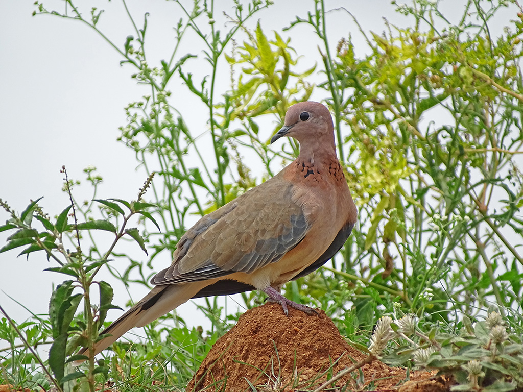 Length about 26 cm; weight ~120–140 g. Small, slender dove with pinkish-buff body, rufous wings, and characteristic black-spotted neck patch.