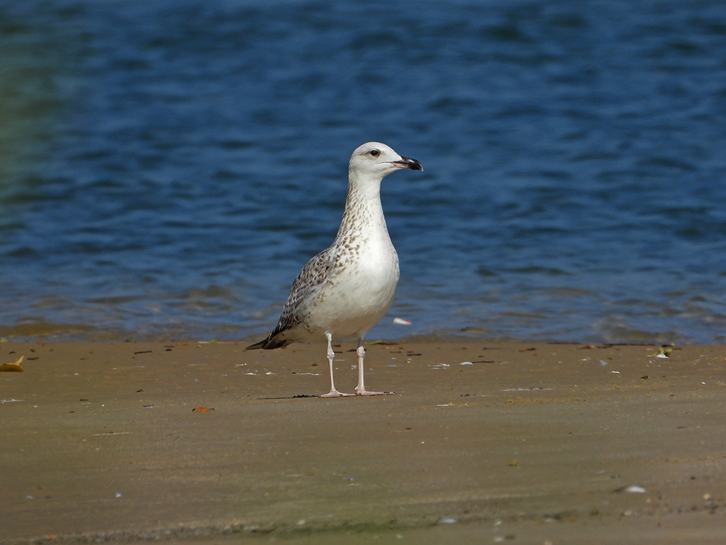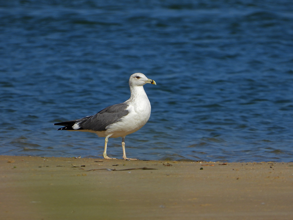 | Approximate size(adult): | A large gull measuring 52–64 cm in length with a wingspan of 124–150 cm and weight between 600–1,100 g. It has a dark slate-grey back and wings, white head and underparts, and yellow legs and bill. The head often shows brown streaks in winter.