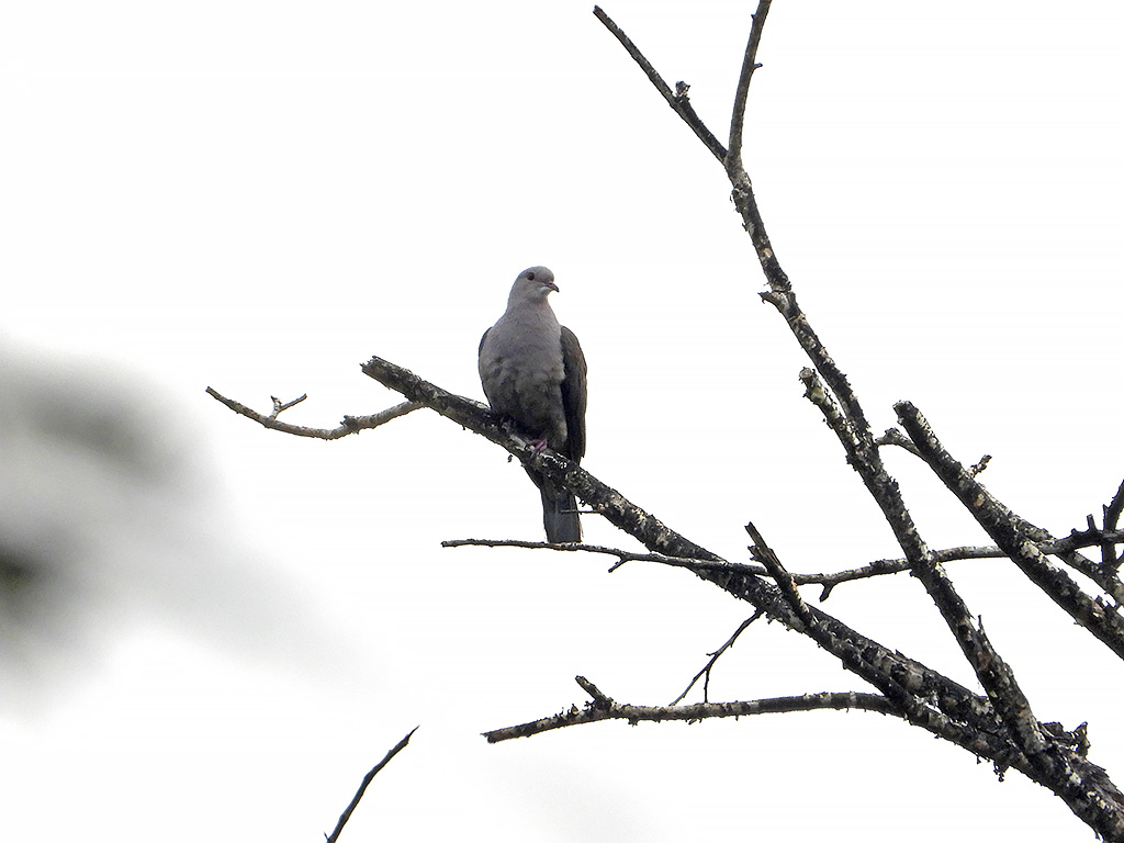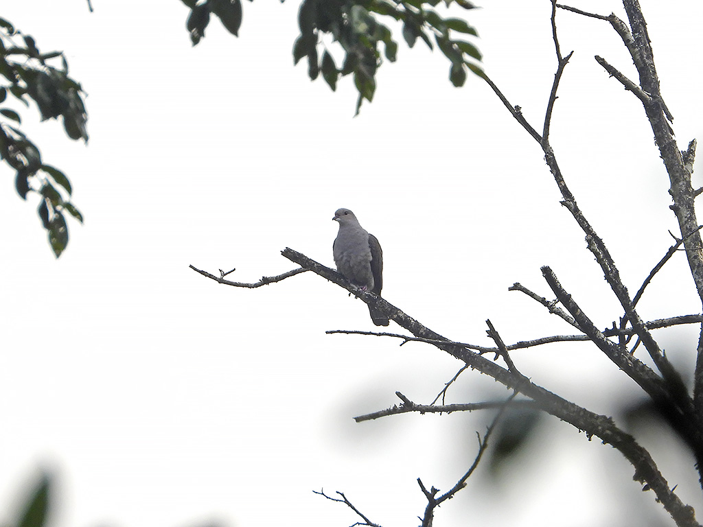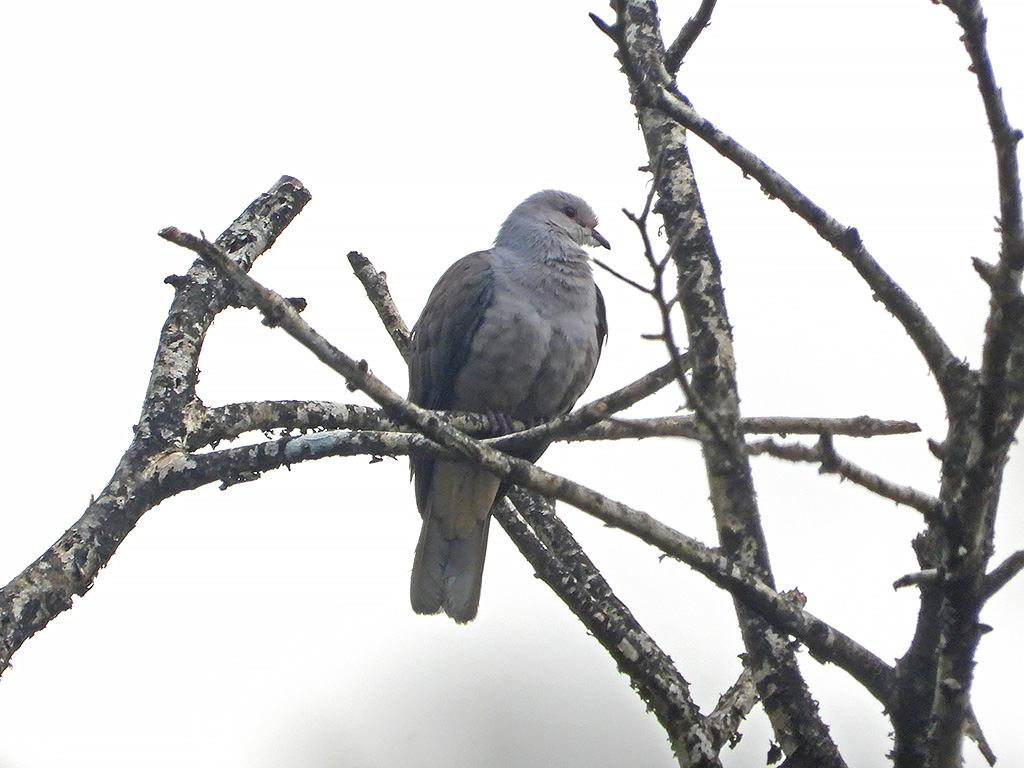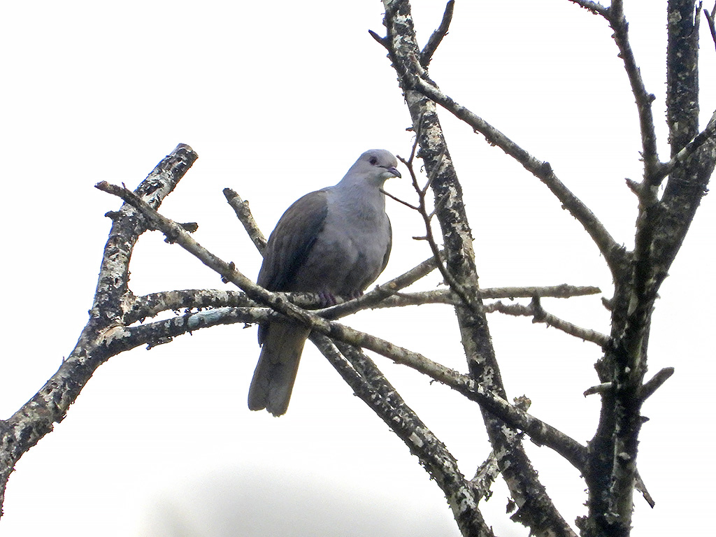 Length about 40–45 cm; weight ~450–600 g. A large, elegant pigeon with glossy coppery-brown plumage, pale grey head and neck, and dark maroon wings and tail. The eyes are deep red, and the overall appearance is stately and rich-toned.