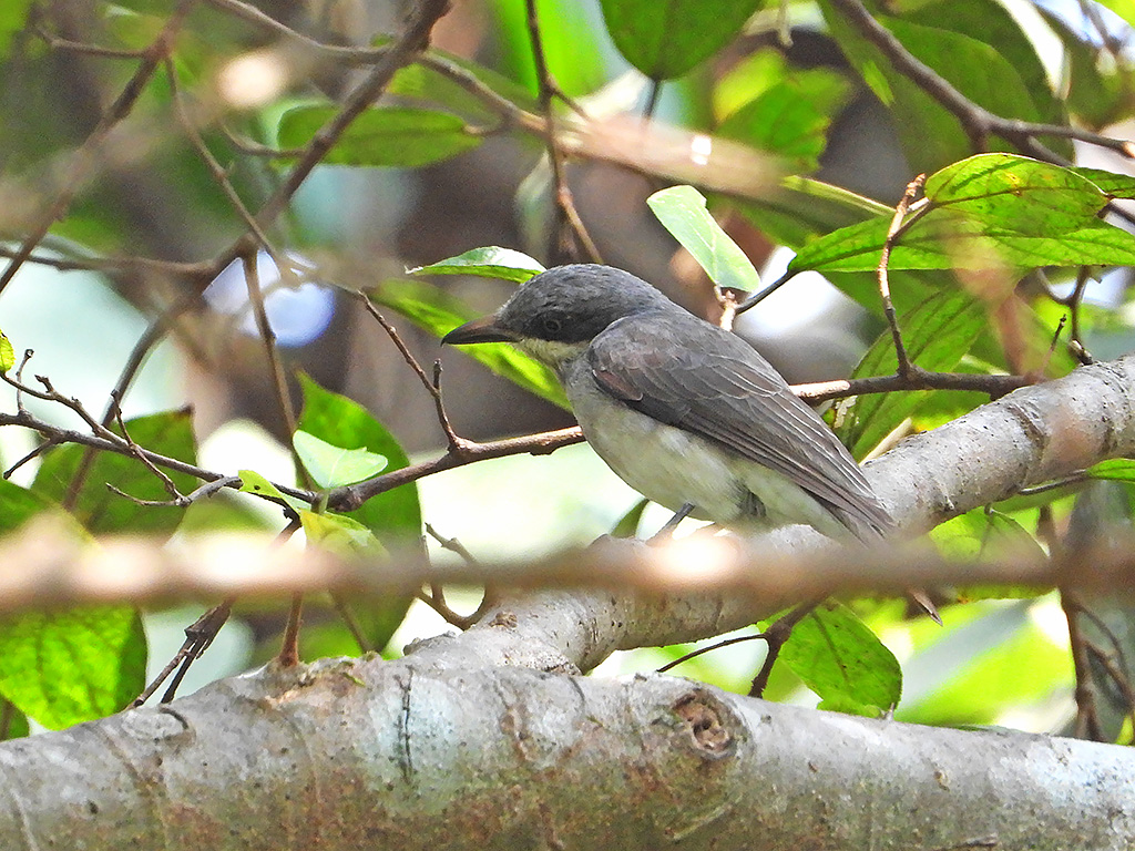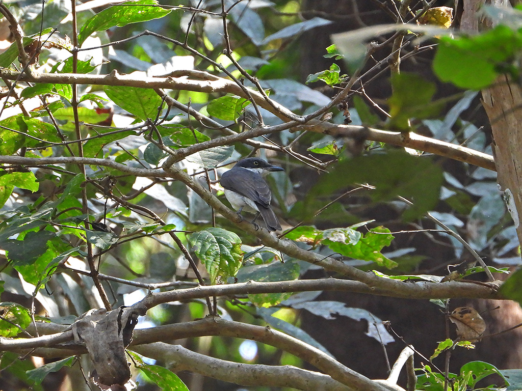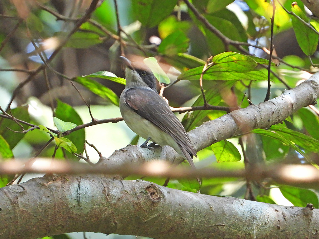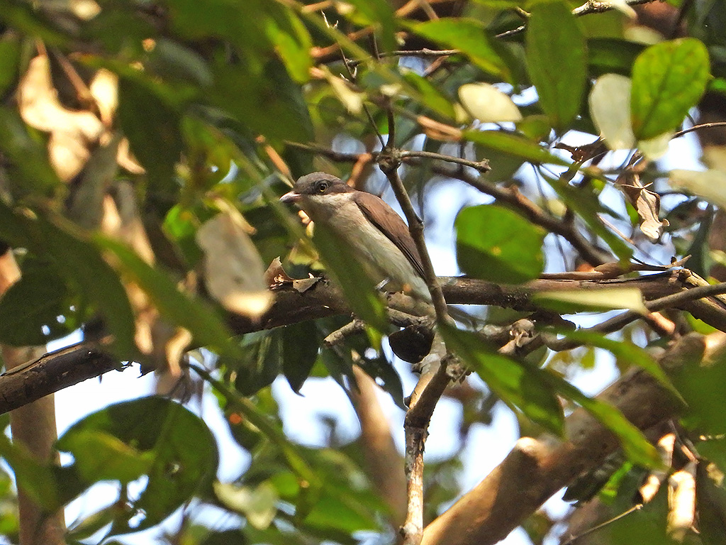 | Approximate size(adult): | A small to medium-sized bird, about 13–15 cm in length. It has ashy-grey upperparts, white underparts with faint streaking, a dark mask through the eye, and a short, hooked bill typical of woodshrikes. Both sexes look similar.