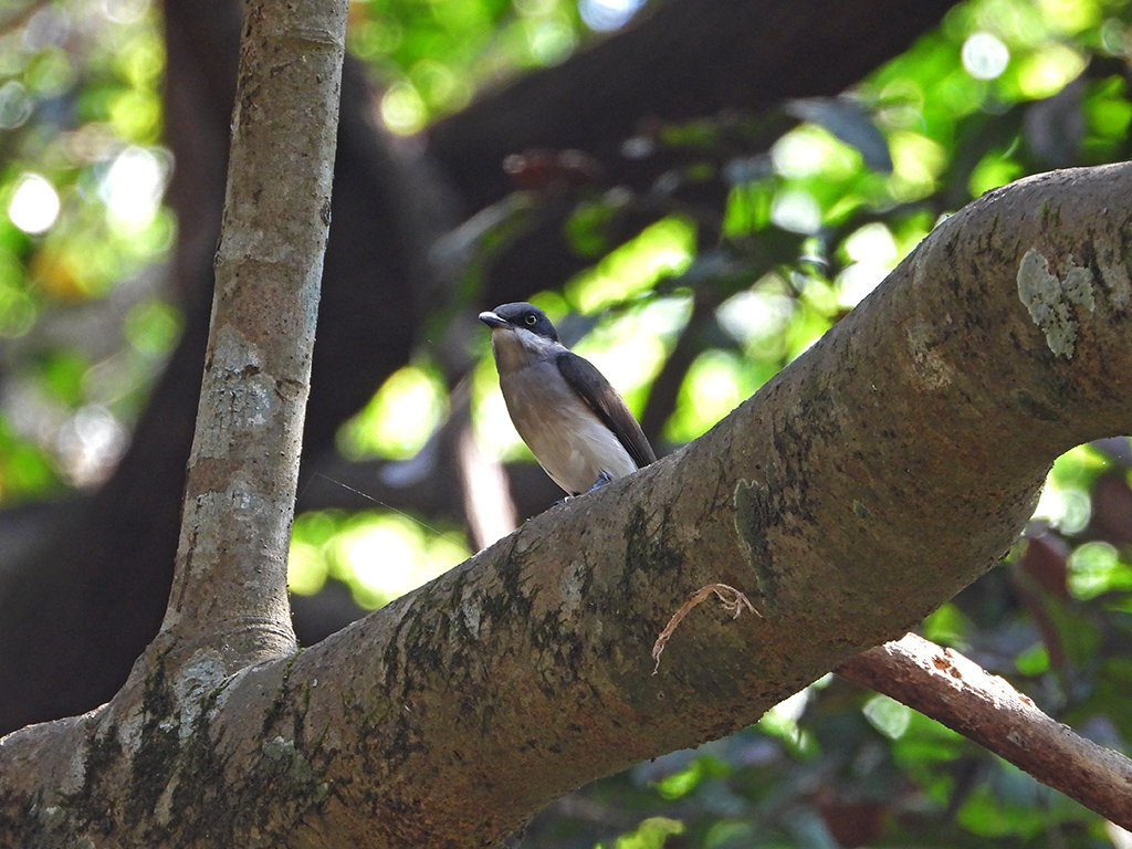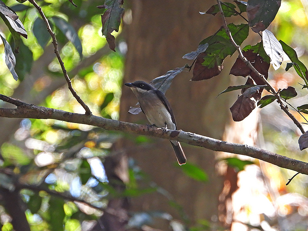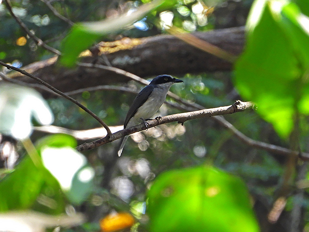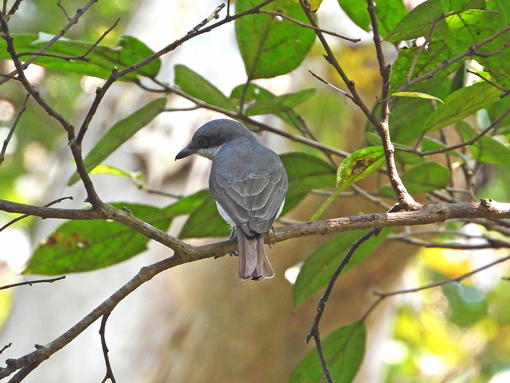 | Approximate size(adult): | A small to medium-sized bird, about 13–15 cm in length. It has ashy-grey upperparts, white underparts with faint streaking, a dark mask through the eye, and a short, hooked bill typical of woodshrikes. Both sexes look similar.