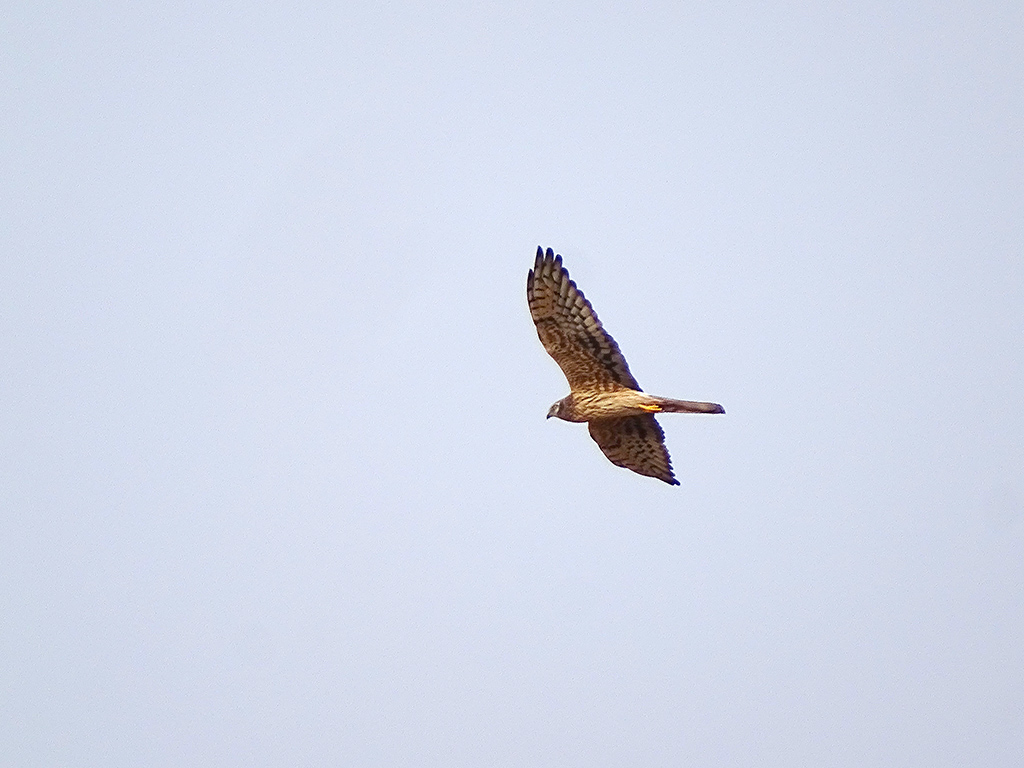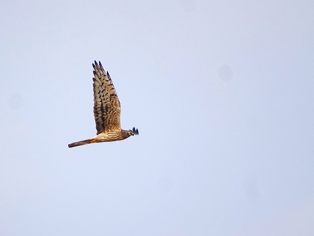 | Approximate size(adult): | Medium-sized, slender harrier measuring 43–47 cm in length with a wingspan of 100–120 cm. Males are pale gray with black wing tips; females and juveniles are brown above with streaked underparts and a distinct white rump.