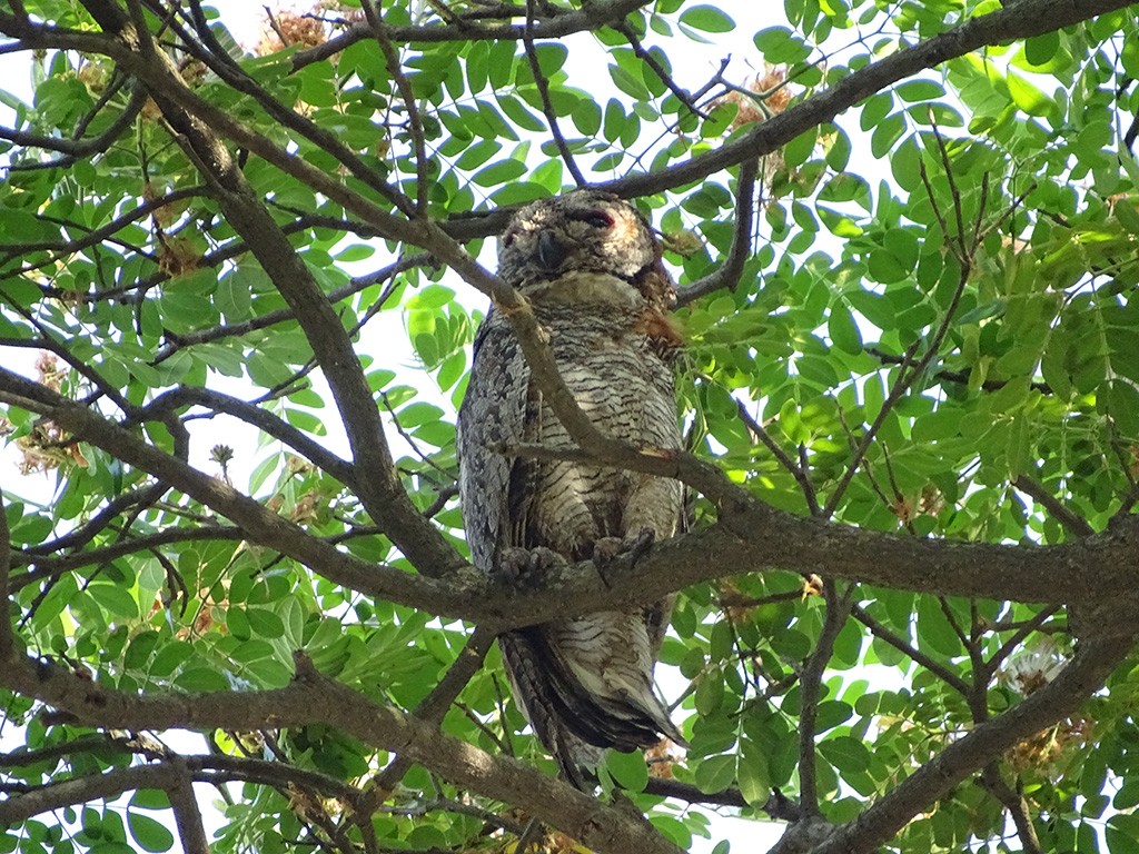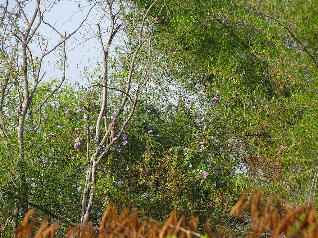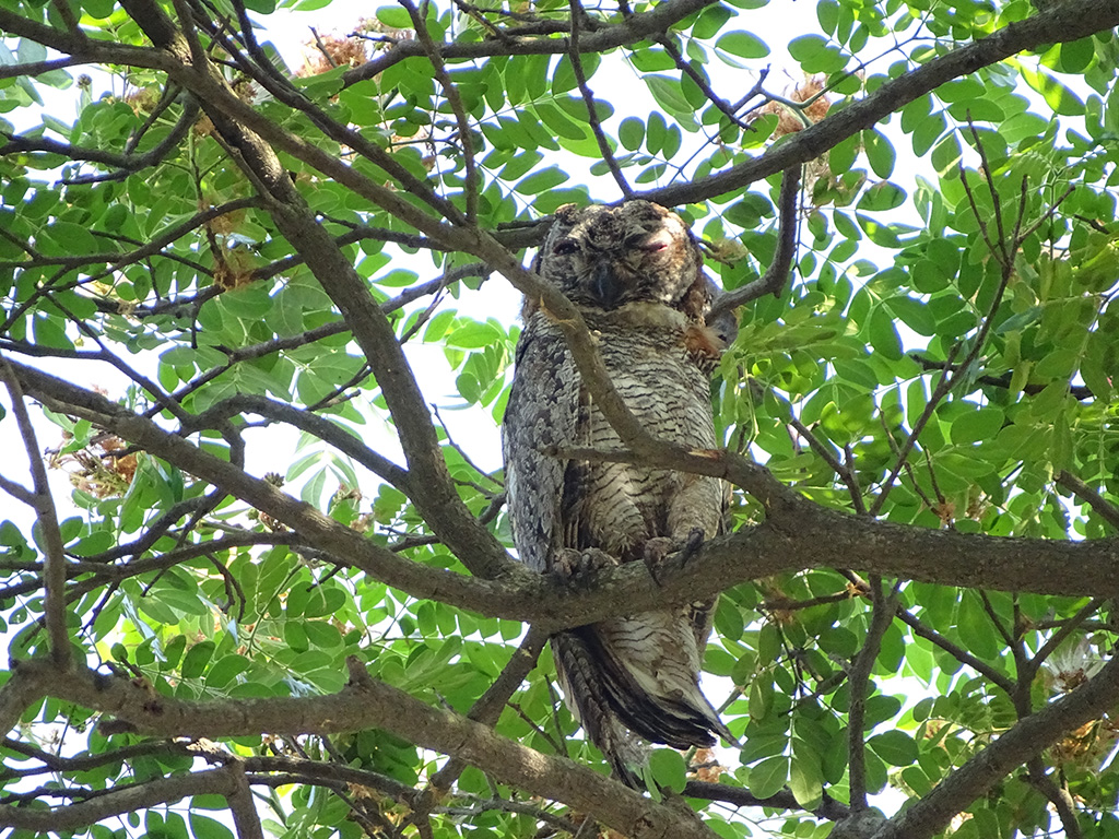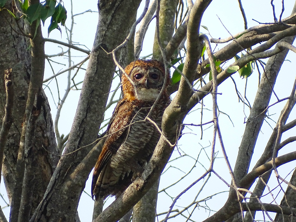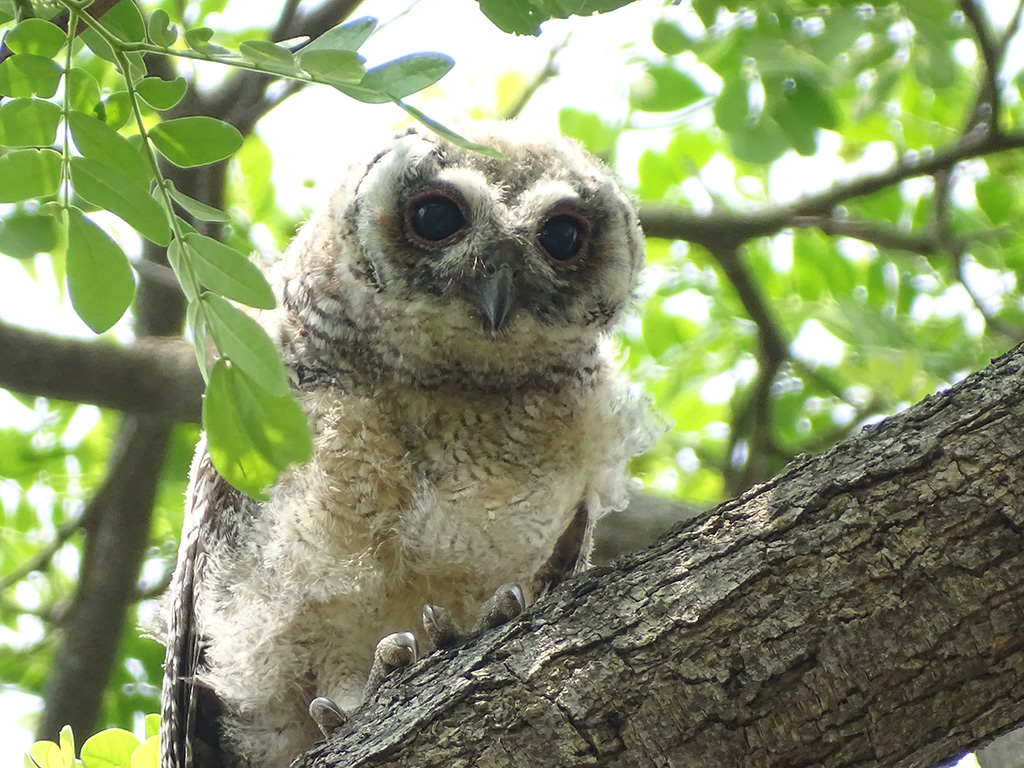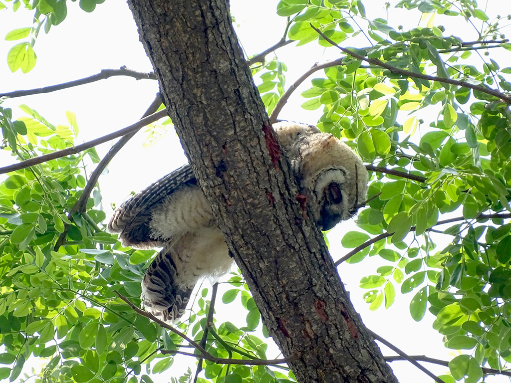 This photo of an immature Mottled Owl was taken in Bengaluru. The day we received information about this species, we prepared ourselves to head out the next day. Although there were four owls in total, one was an adult and three were immature. The owl was quite cute and fluffy, sitting on a branch and almost completely hidden. It was difficult to spot it, even though there weren't many branches around, but it was incredible how well it camouflaged itself. If it hadn't moved, we wouldn't have been able to see it. The owl was basically sleeping in the early morning, and it took about three more hours for it to wake up, move its head, or blink its eyes. After that, it took another two hours before it started to move a little, scratching and adjusting its body parts. Sometimes, it posed in unusual ways, looking both cute and funny.
