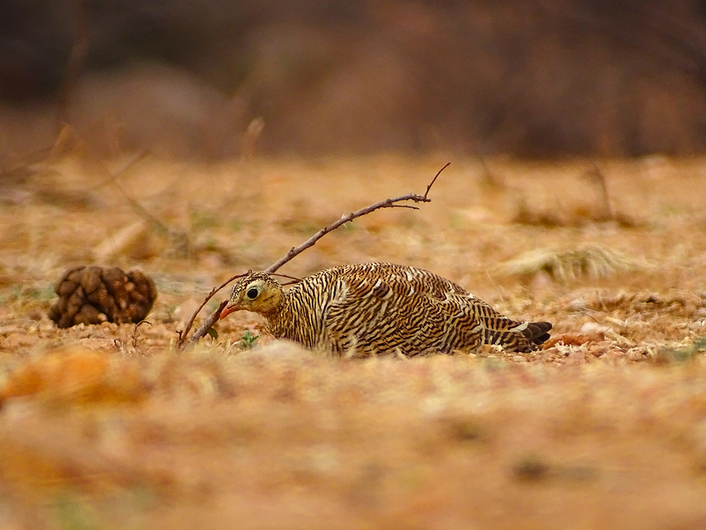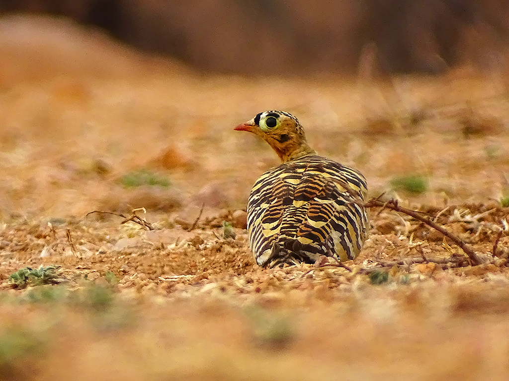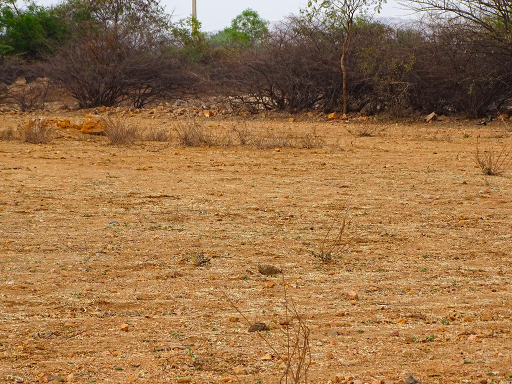 Pic 1 and Pic 2 show female Painted Sandgrouse. After we finished our visit to Daroji Sloth Bear Sanctuary, we exited through the main sanctuary gate, and our driver took us to a nearby field to see these beautiful sandgrouse. Our excitement was at its peak because they were Painted Sandgrouse. Moreover, the driver was so confident that he would easily find this stunning bird, which made me even more excited. Time seemed to slow down for me. In a large, barren field, he began searching for the bird. You wouldn’t believe it, but it took him only two minutes to find it. He pointed it out to us, and we saw a pair of sandgrouse foraging on the ground.