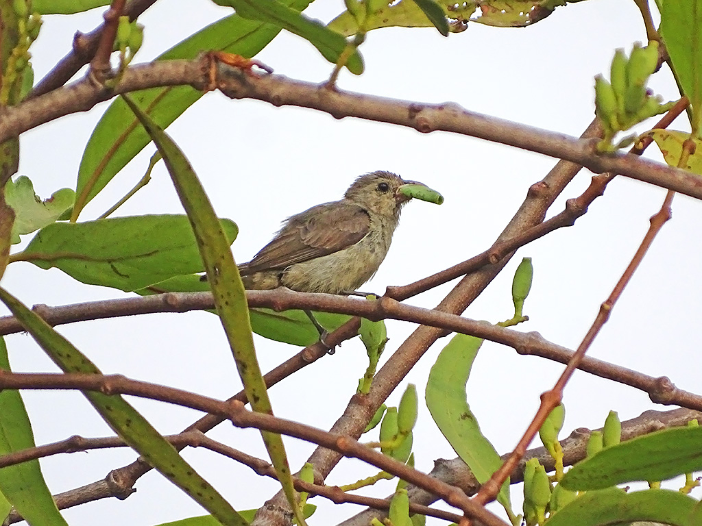 A beautiful tiny bird always draws attention with its chirping. If you observe its color in proper light, you will notice its pale bill. Most of the time, I notice it picking up a rounded green fruit that looks slightly larger than its capacity, yet it finishes it so easily and smoothly. Then, it perches on another branch before flying away. Sometimes, it is difficult to capture the bird as it is very restless and tiny. However, once you manage to capture it, you will get such a beautiful shot that you won’t even believe it.