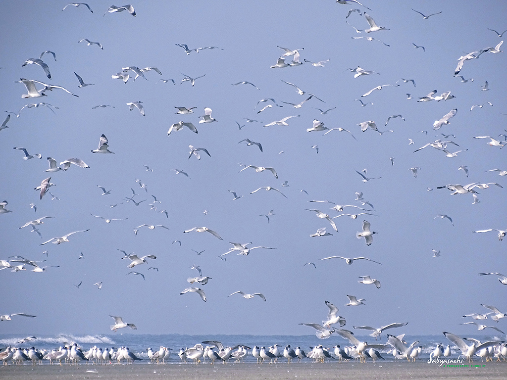 | Approximate size(adult): | A large gull measuring 55–60 cm in length with a wingspan of 140–160 cm. It has a massive black head in breeding plumage, white body, pale grey upperwings, and a heavy yellow bill tipped with red. Non-breeding adults lose the full black hood, retaining only smudges on the head.