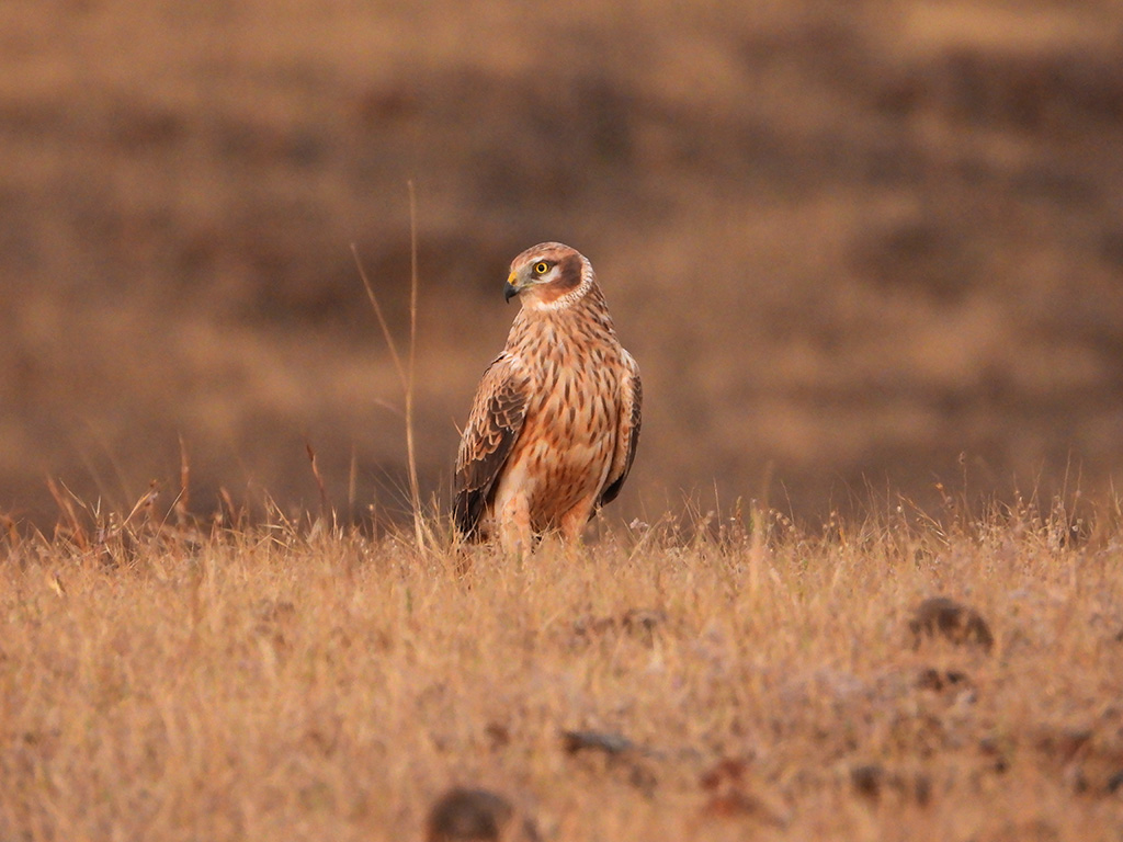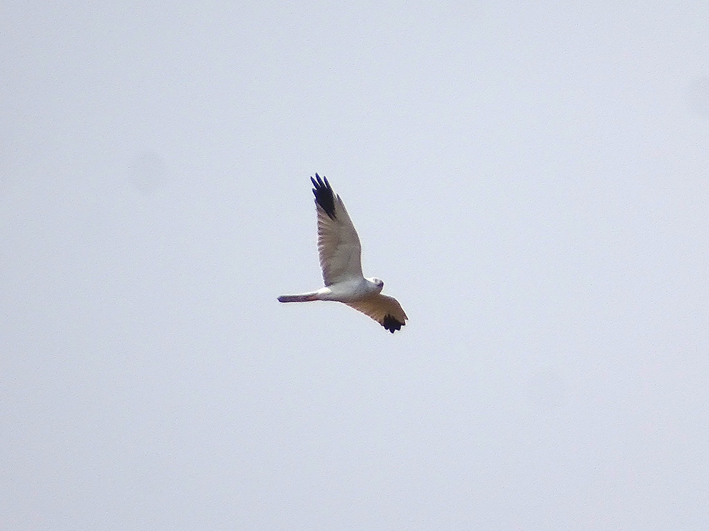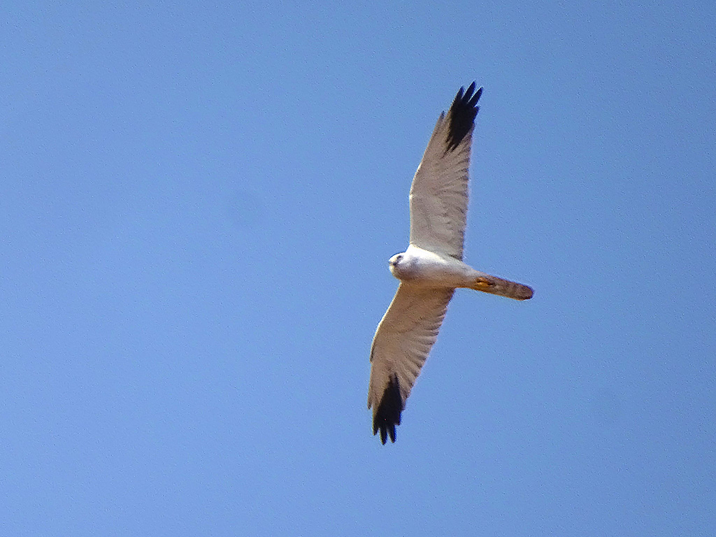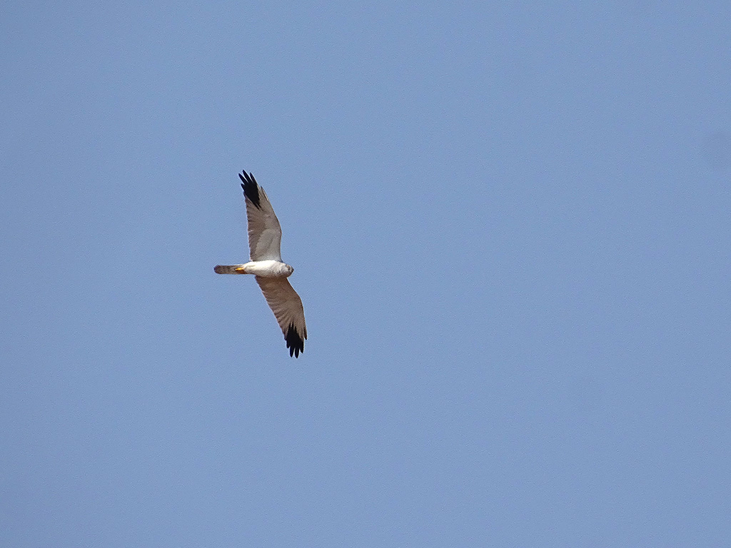 | Approximate size(adult): | Medium-sized harrier, about 40–48 cm in length with a wingspan of 95–120 cm. Males are pale gray above with a white rump and black wing tips, while females and immatures are brown with streaked underparts. Slender body and long wings give it a buoyant flight.