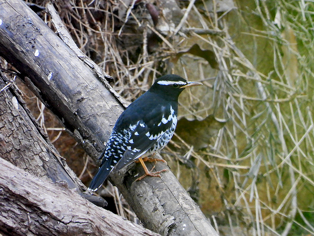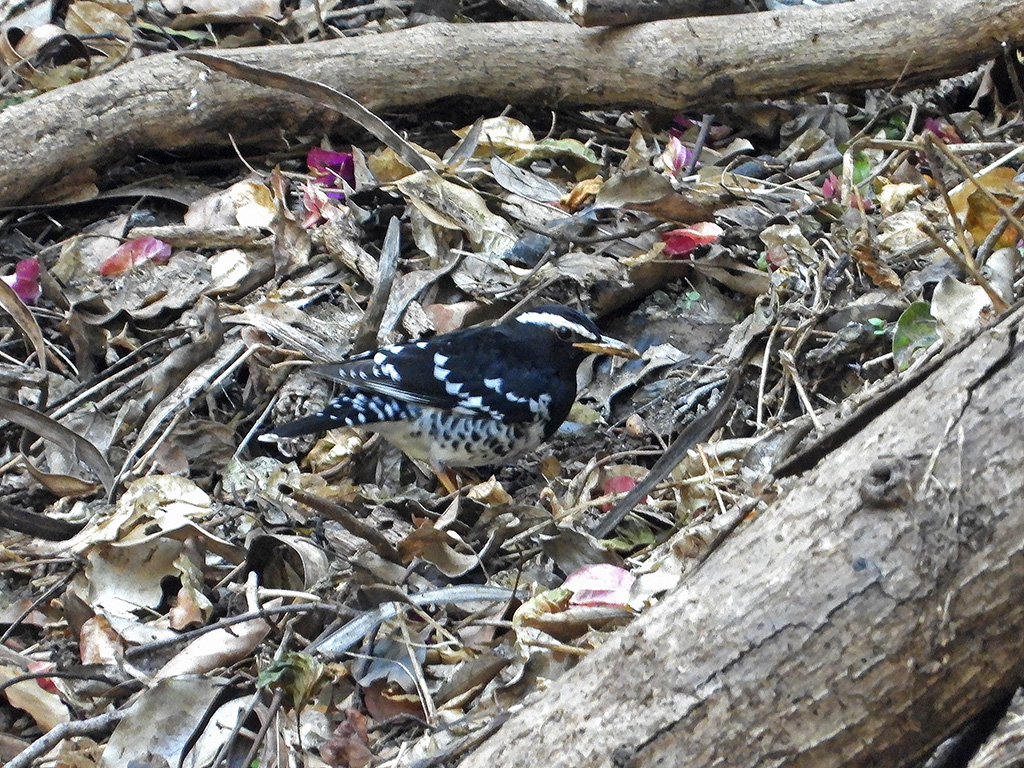 | Approximate size(adult): | Length about 20–23 cm; weight around 55–65 g. The male is striking with black upperparts, white underparts, and bold white wing patches, while the female is brownish with scaled underparts and less contrasting plumage.