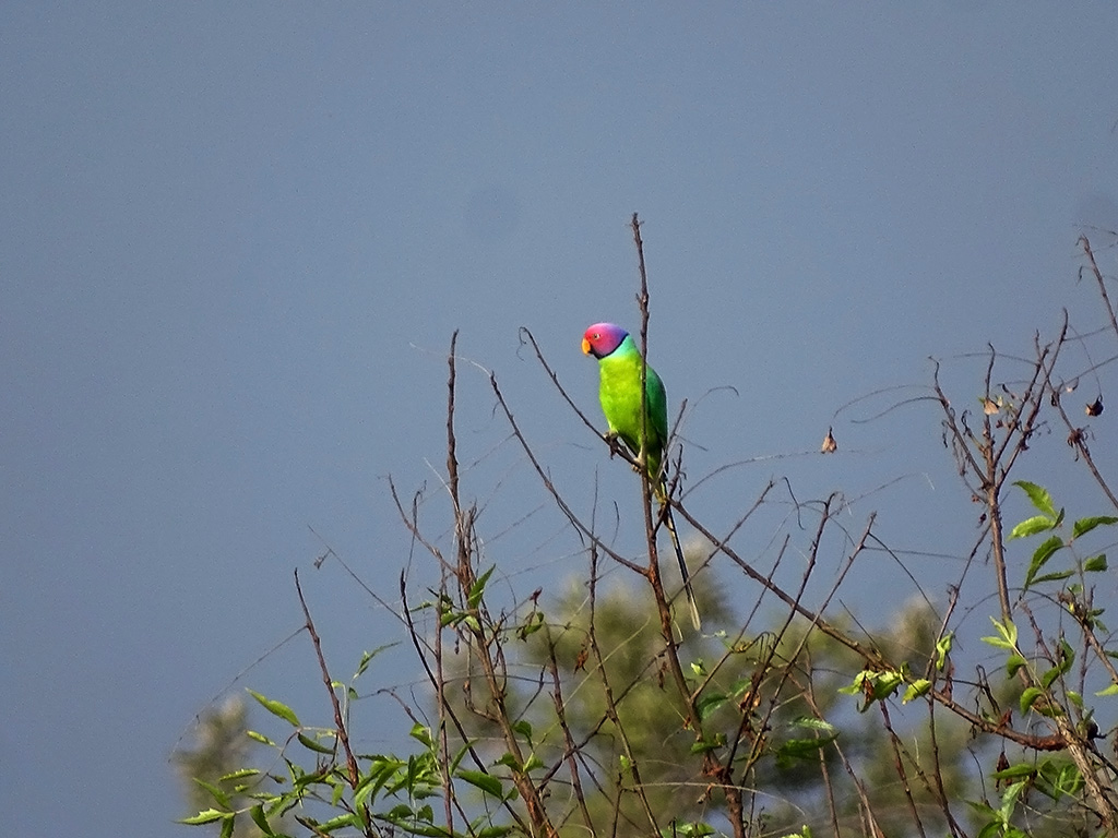 | Approximate size(adult): | Length about 33–37 cm including the long tail; weight 55–65 g. A medium-sized parakeet with a slender build. The male has a rich plum-colored head, bluish nape, and green body, while the female has a duller bluish-grey head. The tail is long and tapering, with bluish tips.