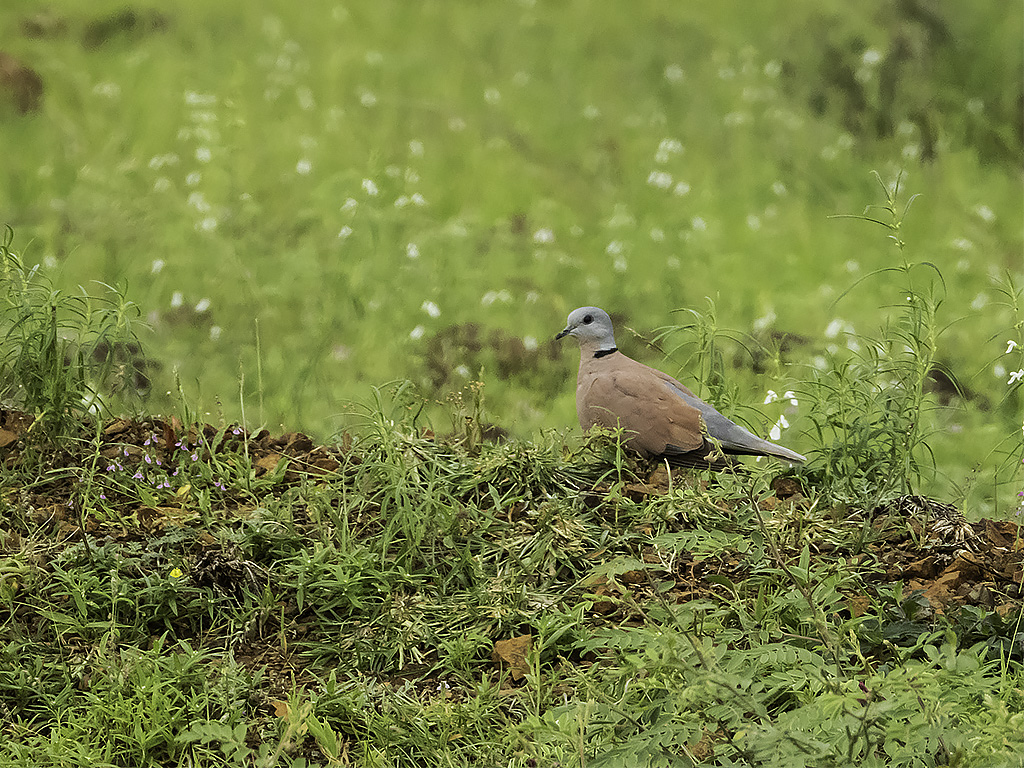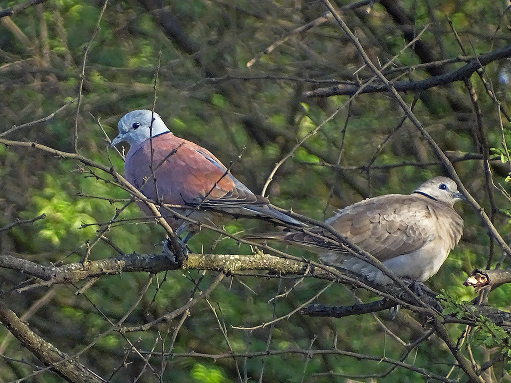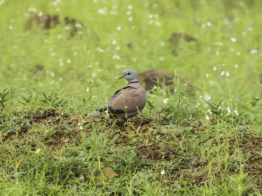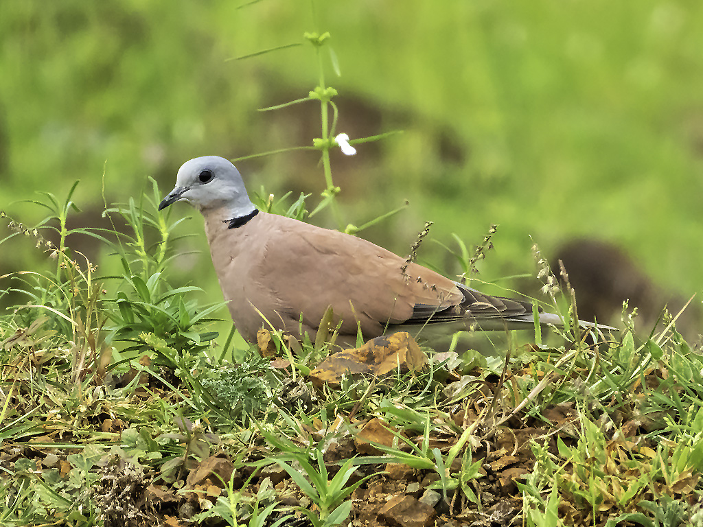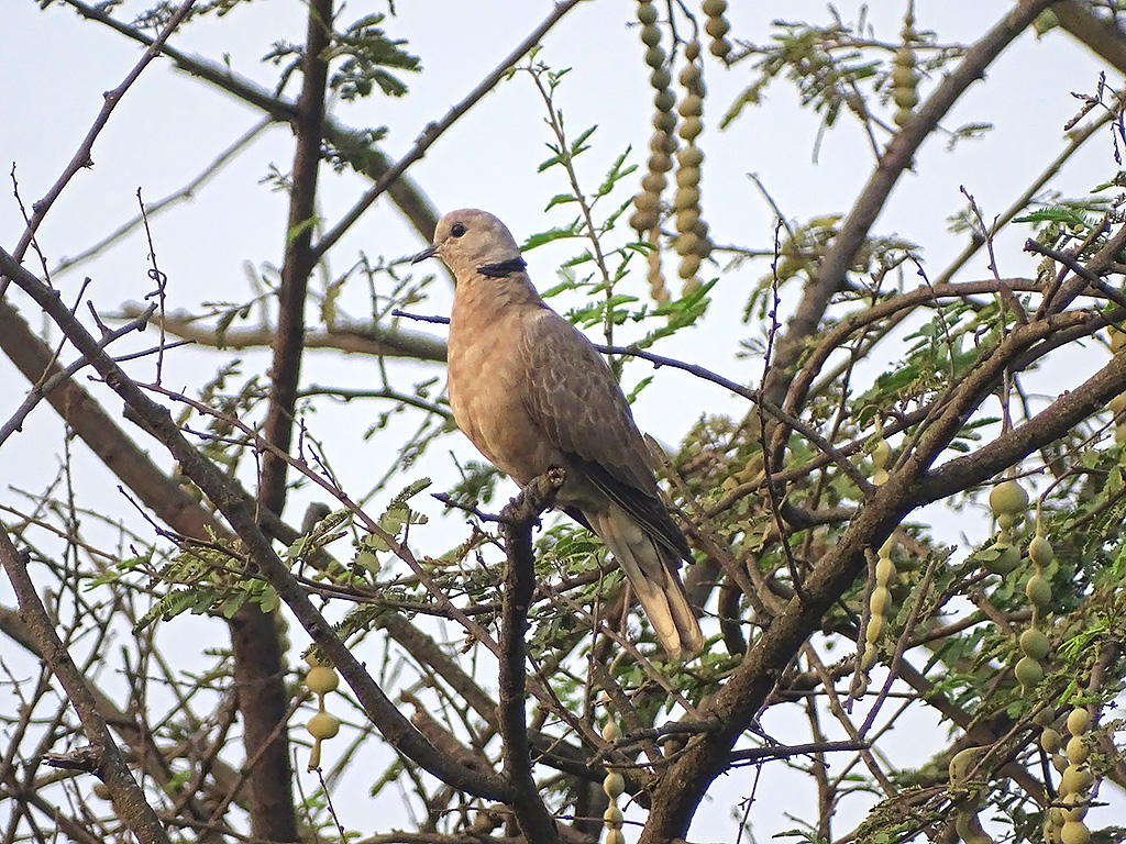 | Approximate size(adult): | Length about 32–34 cm; weight ~200–250 g. A medium-sized dove with pale grey-brown body, reddish collar on the nape, and pale underparts. The tail is long and pointed.