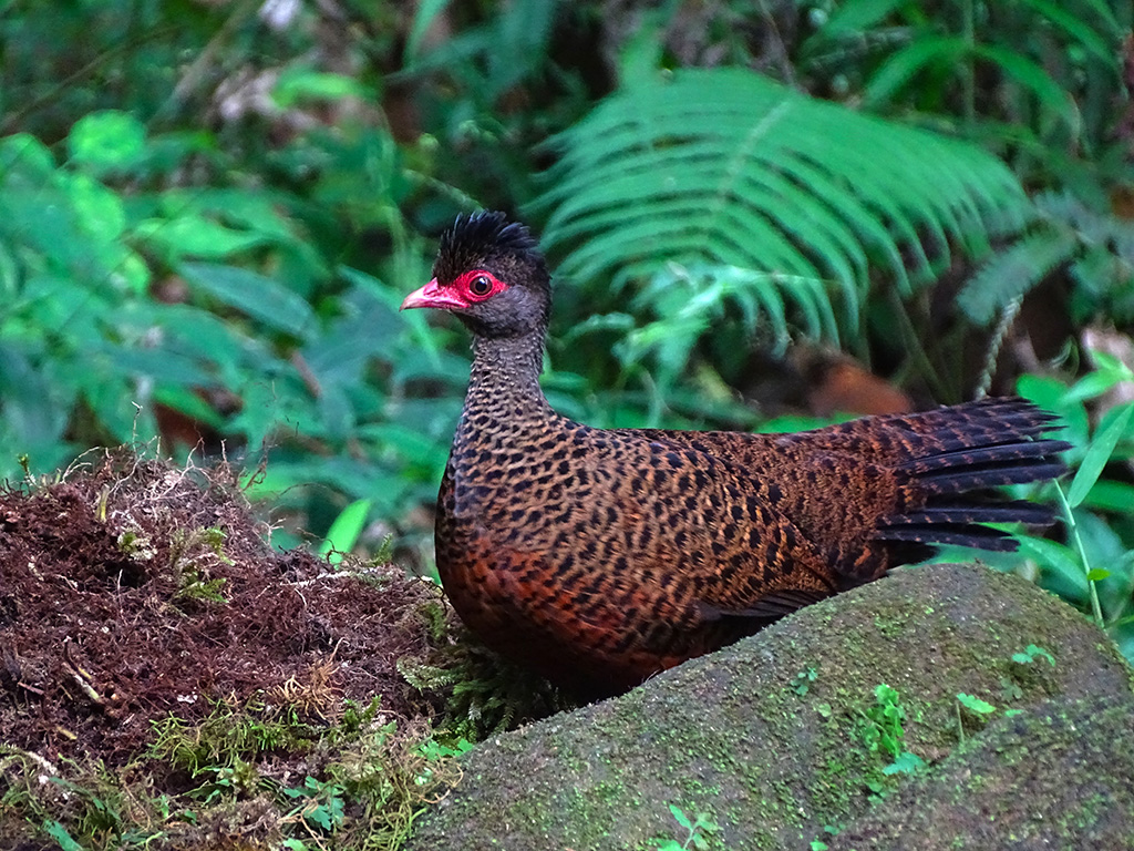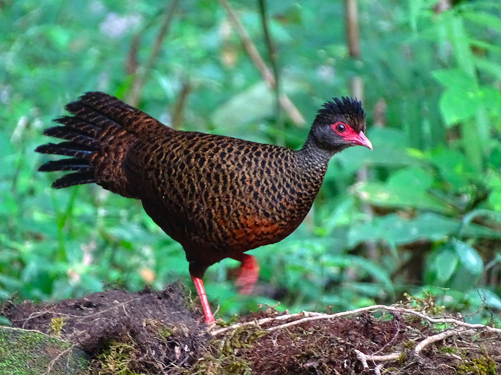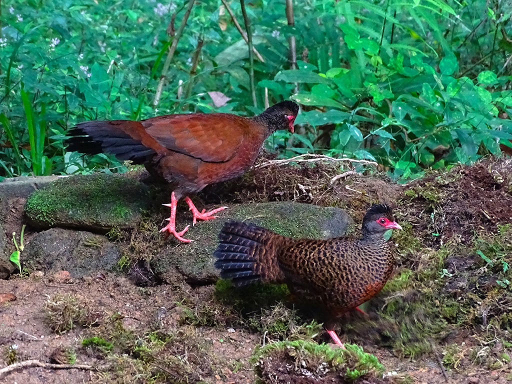 The female arrived first and started consuming the worms placed on the trunk. After 10 minutes of eating, it went back into the jungle. Later, I realized it had gone to call its male partner, and they both returned. It is relatively easy to photograph it, as its behavior is somewhat similar to that of a rooster. However, if you encounter it in the jungle and it tries to run away, capturing it becomes challenging. Within a fraction of a second, it hides itself in the bushes and then reappears amidst the clutter.
