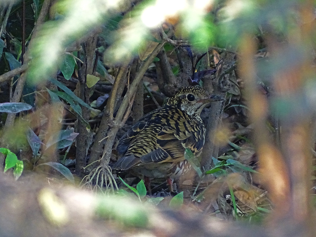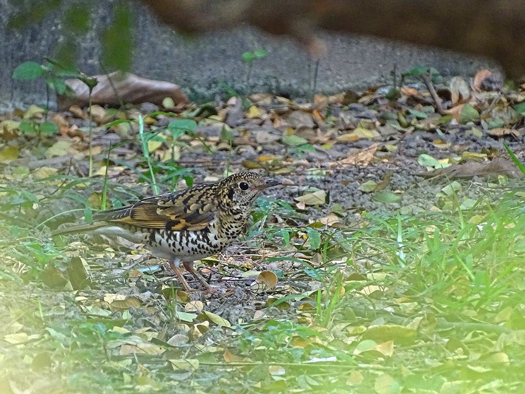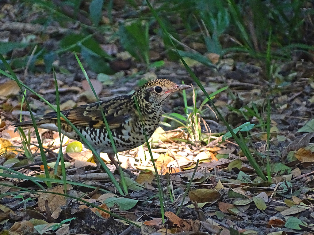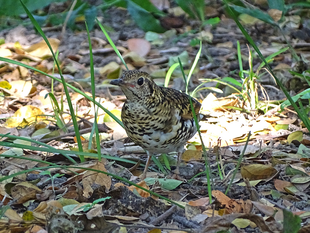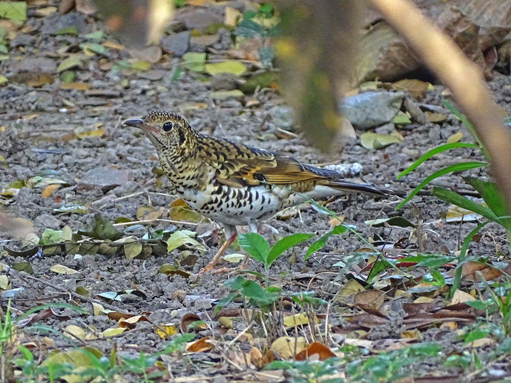 | Approximate size(adult): | About 27–28 cm in length; weight ~80–120 g. A medium-sized thrush with brown upperparts, distinctively scaly-patterned underparts (dark crescent-shaped markings on pale background), and a pale eye-ring. Tail is brown with faint barring.