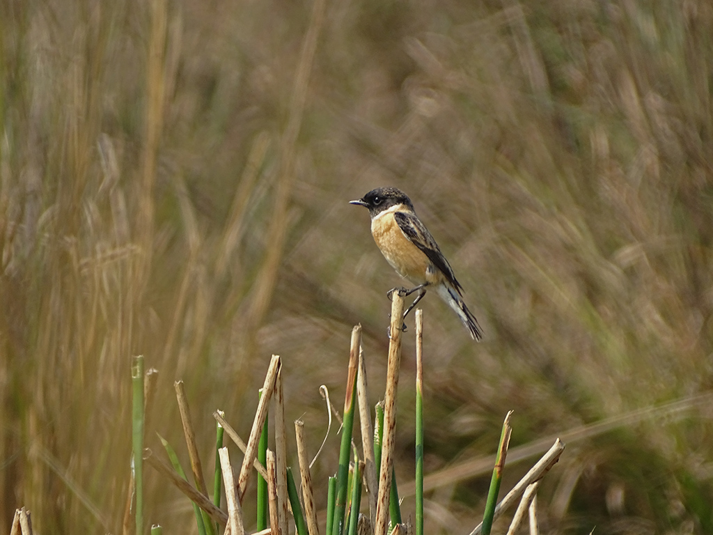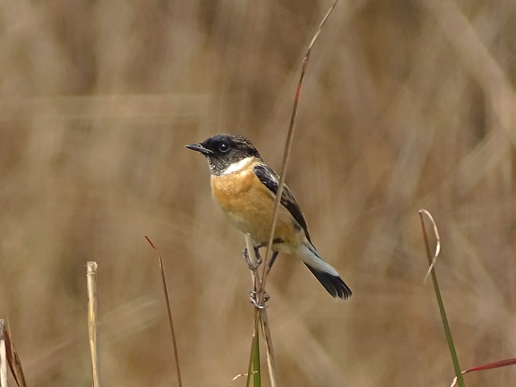 | Approximate size(adult): | About 12–13 cm in length; weight ~14–20 g. Males have a black head, white collar, orange-brown chest, and brownish back, while females are paler with a buffy chest and brown-streaked back. Tail is black with white bases.