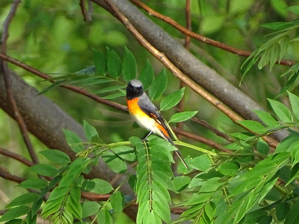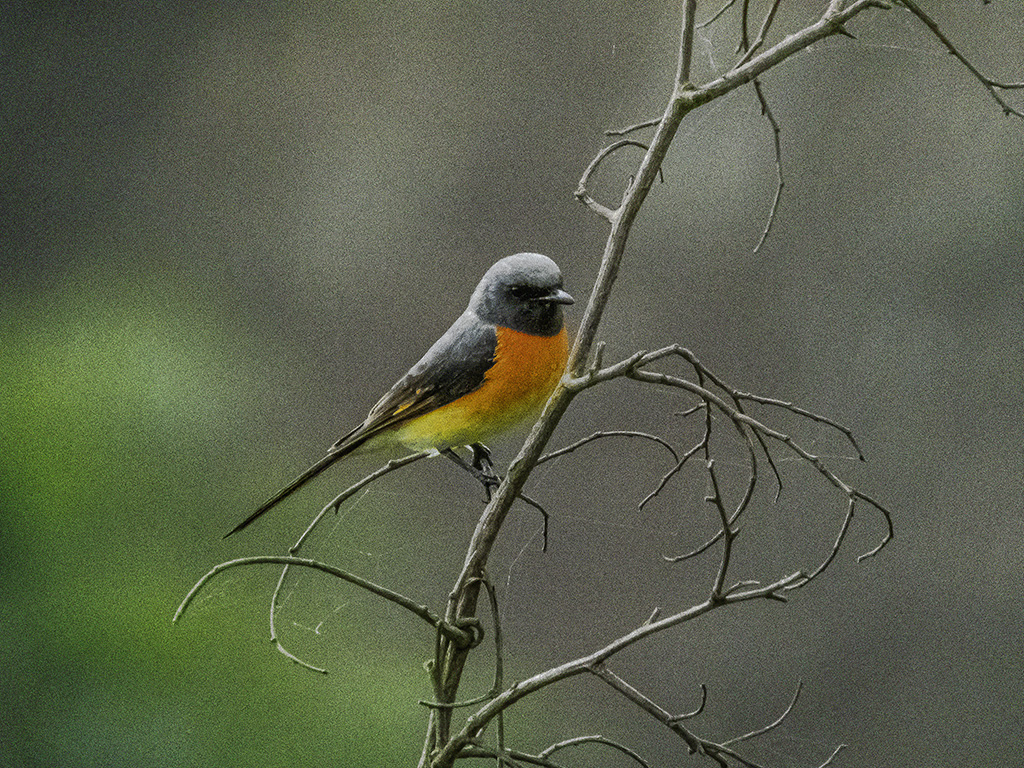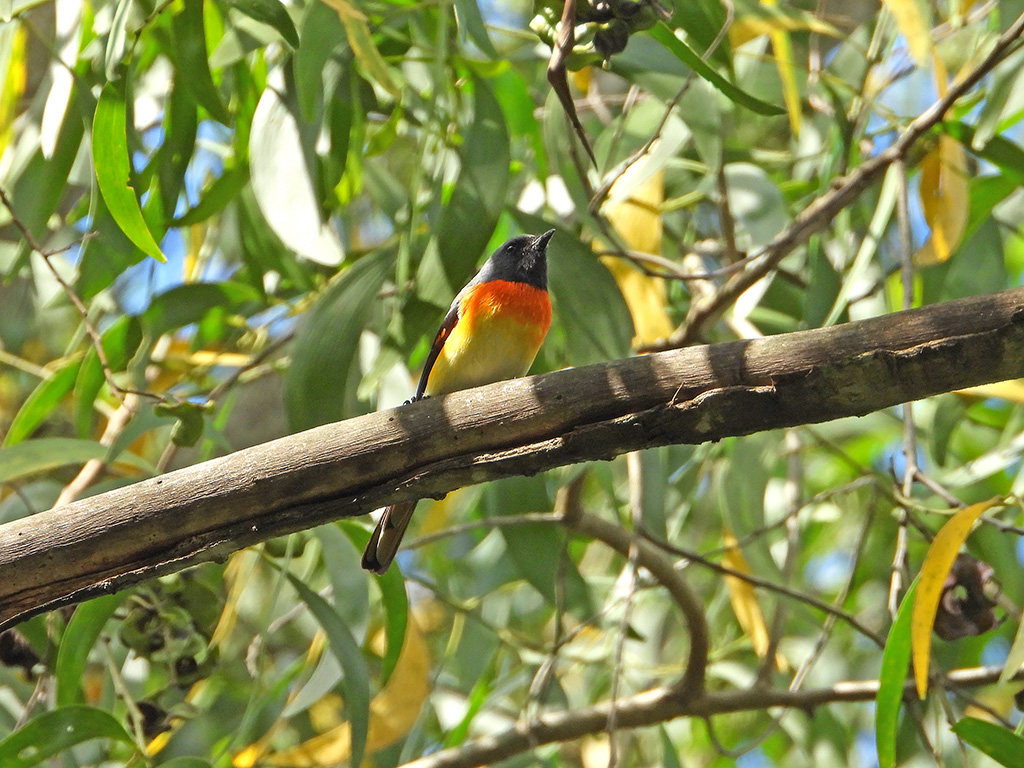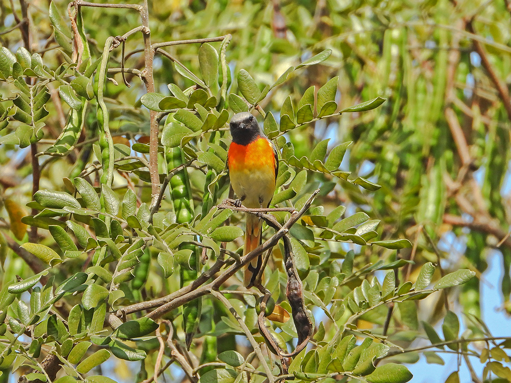 | Approximate size(adult): | Length about 16–17 cm; weight ~15–20 g. A small, slender passerine with bright orange-red underparts and black upperparts in males; females are olive-grey above with yellowish underparts. The wings are black with white markings.