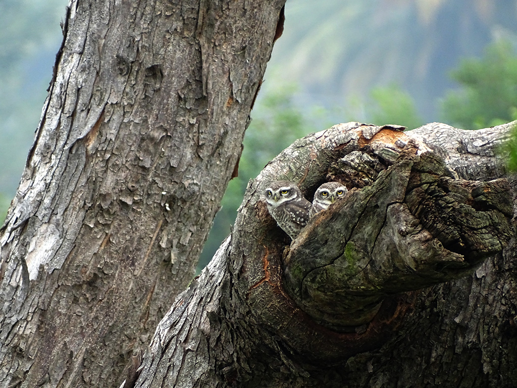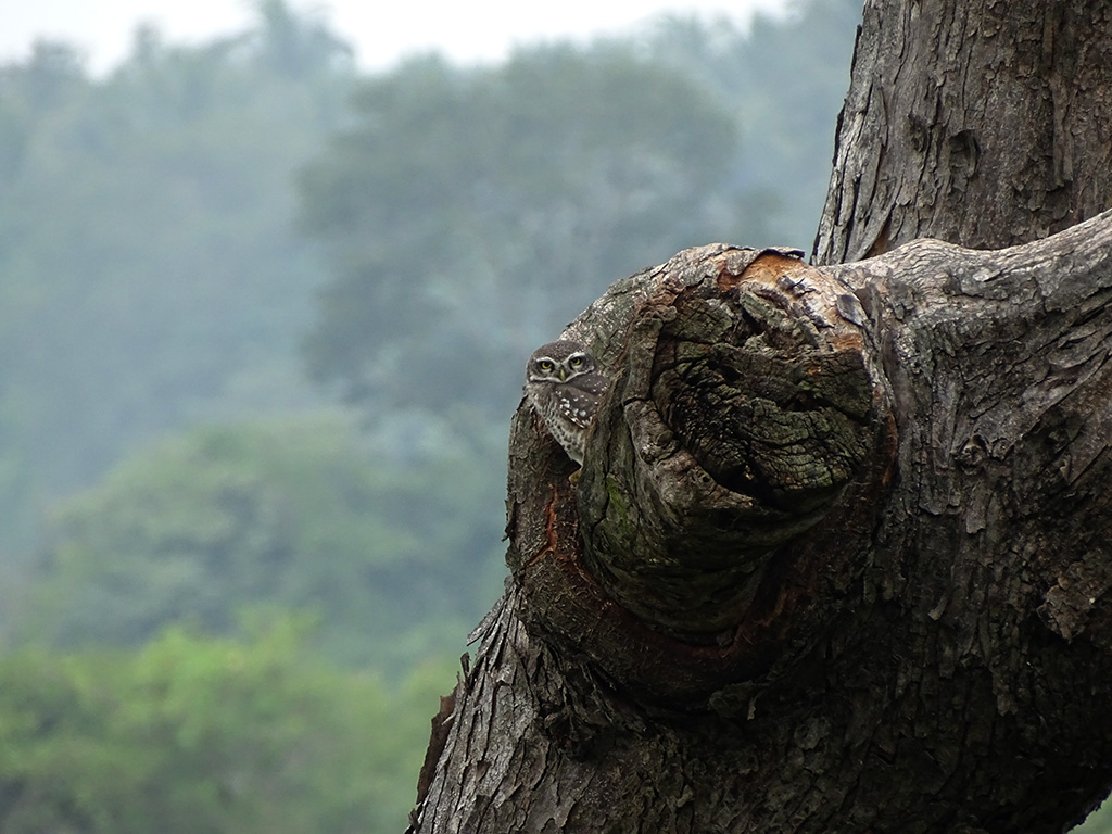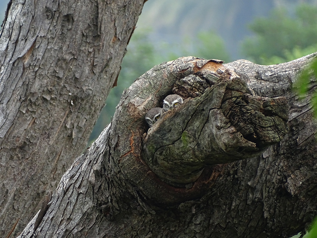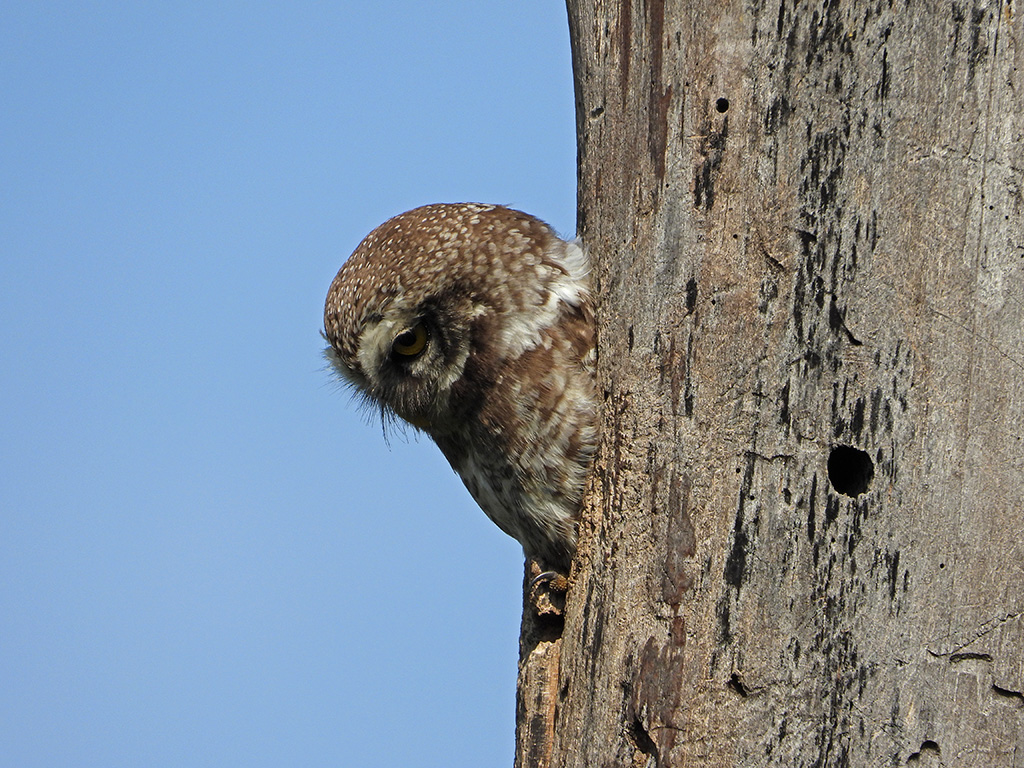 | Approximate size(adult): | Length about 20–21 cm; weight around 120–150 g. Small, stocky owl with grey-brown plumage, white spots, and bright yellow eyes.