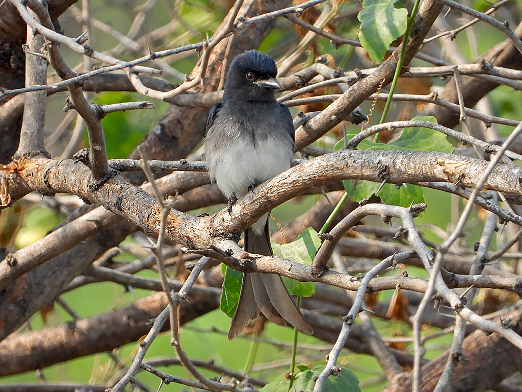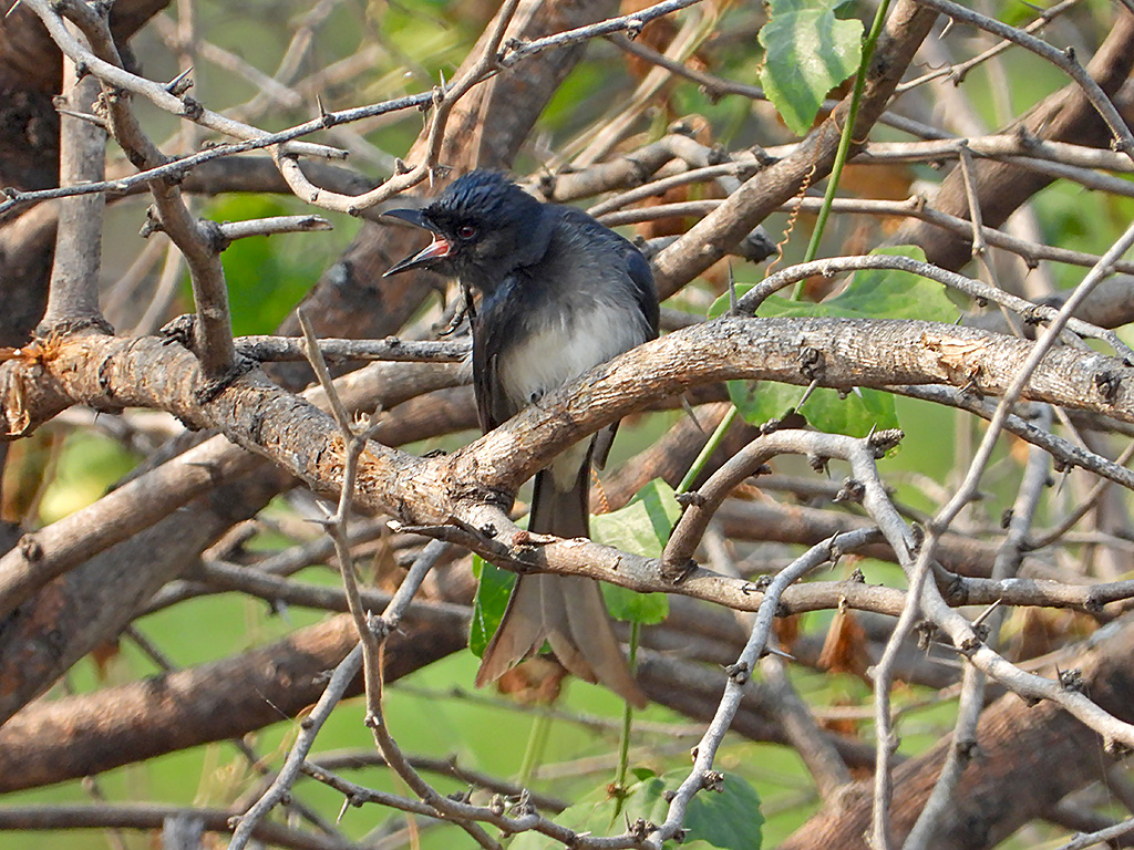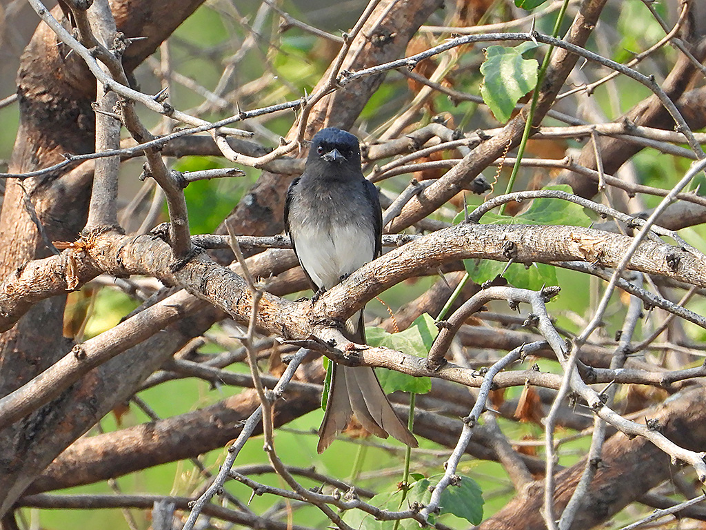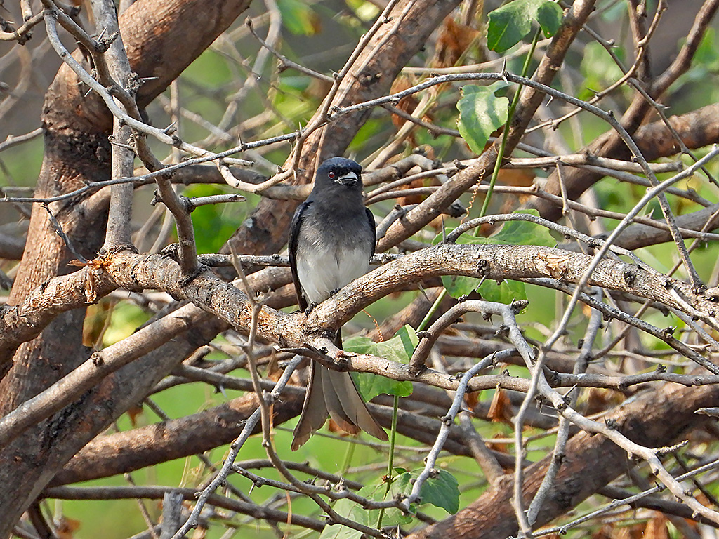| Approximate size(adult): | Medium-sized drongo, about 25–30 cm long including the tail. Has glossy bluish-black upperparts, white underparts, and a deeply forked tail. Juveniles are duller and less glossy.