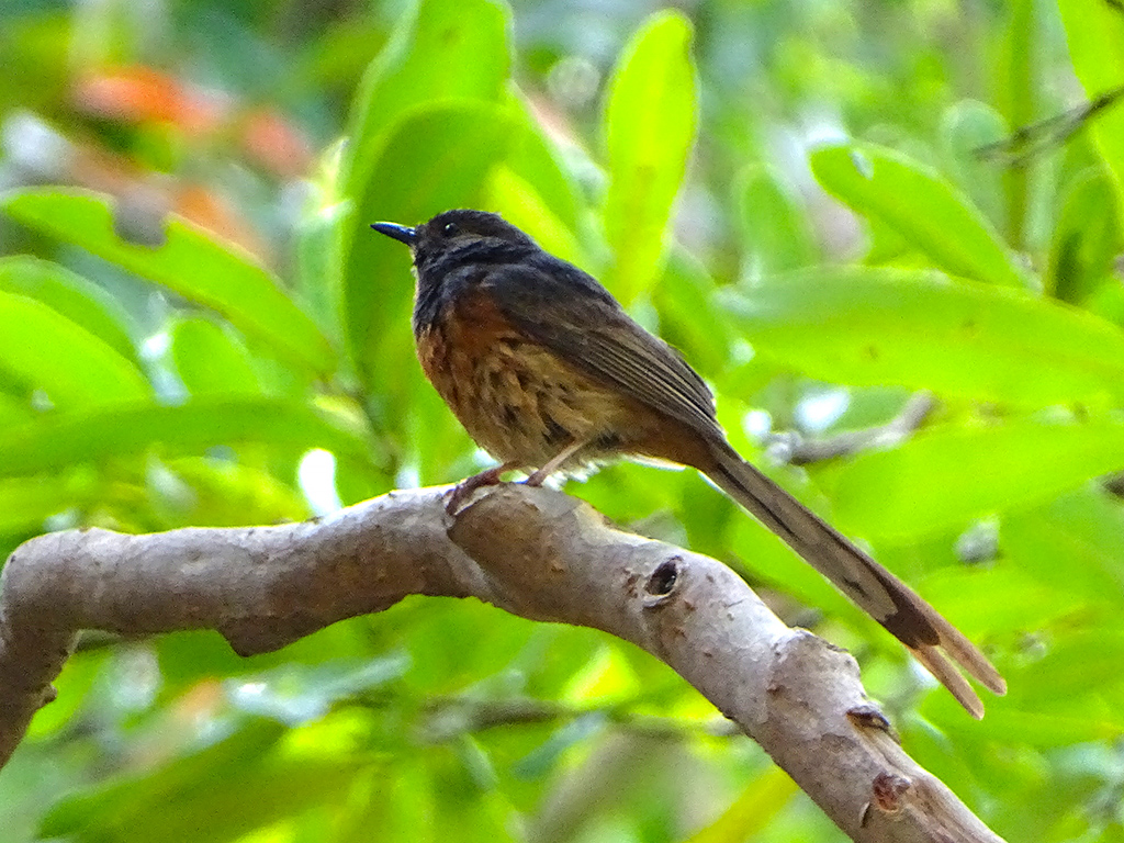 This Shama is another gem of Muthyala Maduvu. People who visit there are sure to spot it, even if they don't know the exact area where it resides. However, 70% of the time, it remains on the ground, amidst clutter, foraging for arthropods. The only one that stays consistently in the forest is an adult male with beautiful plumage. About 30% of the time, it perches in the open, which provides an excellent opportunity for photographers or birdwatchers to take photos. This Shama is very famous for its beautiful, long, and loud call. When it calls, you'll want to watch it, as it produces many tones simultaneously. Sometimes, it even mimics other birds. The most beautiful part of this bird is its long tail with a white rump. When it calls or sits on a clear perch, it continuously erects its tail.