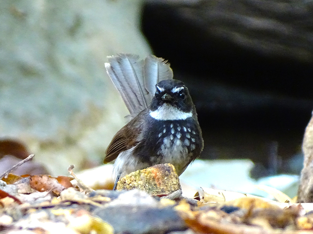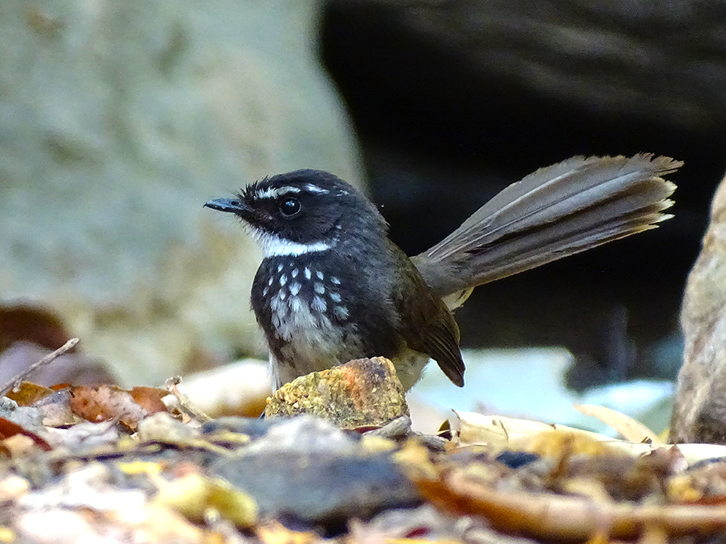 A small, active fantail about 17–20 cm long, including its long, fanned tail. It has a dark brown upper body, white throat and eyebrow, and distinct white spots on the breast and wings, which give it its name. Tail edges are white and often spread in display.