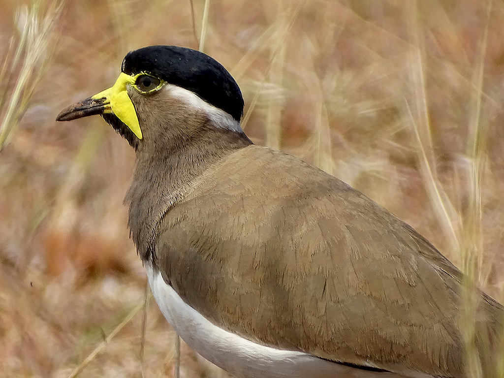 A medium-sized lapwing measuring 30–32 cm in length with a wingspan of 70–75 cm. It has pale brown upperparts, white underparts, yellow legs, and a distinct yellow wattle in front of the eyes.